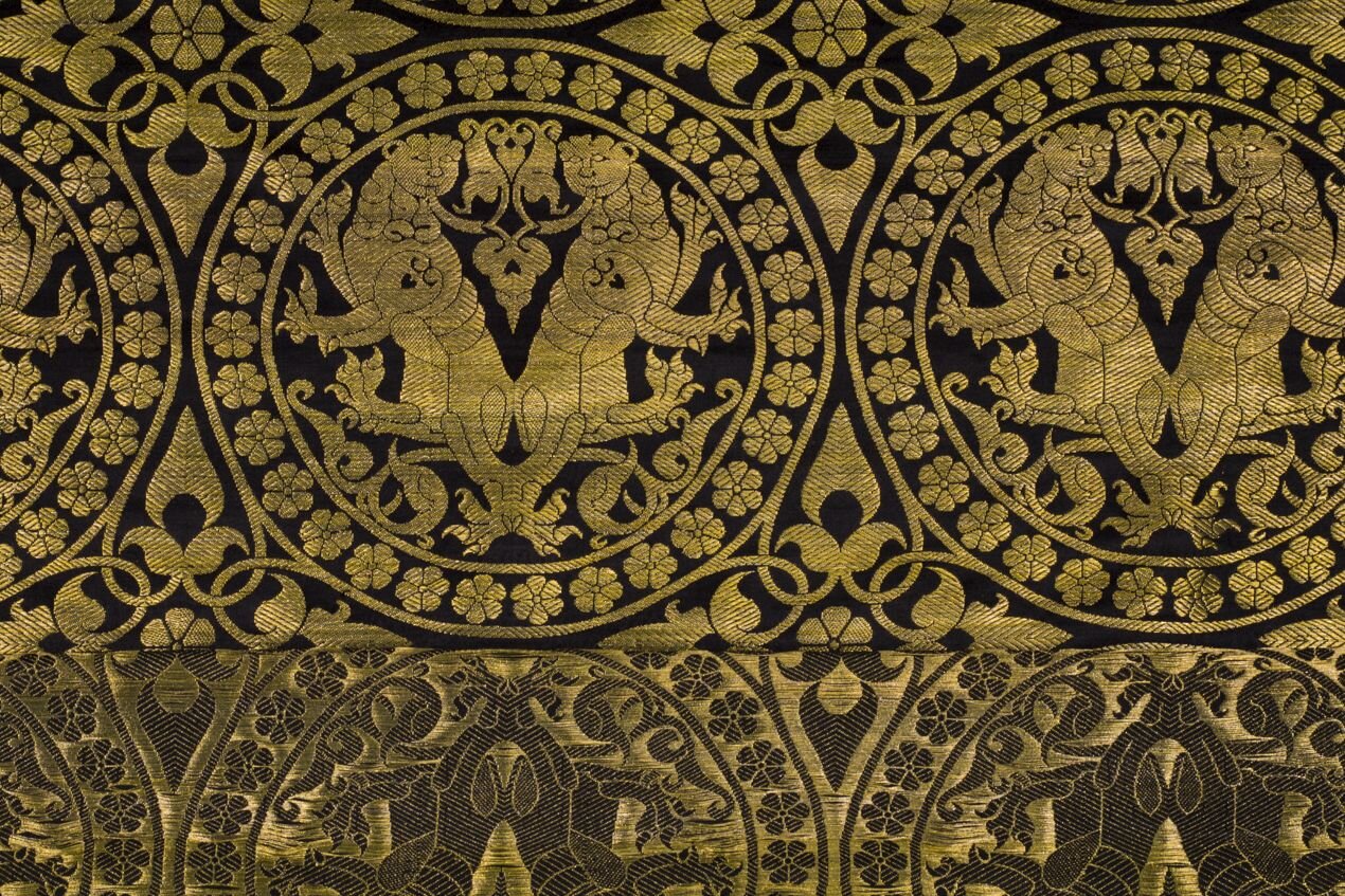 Tato replika historického brokátu je ručně tkaná žakárová látka z čistého hedvábí a skutečných kovových nití pozlacených pravým zlatem. Díky vysoce kvalitním materiálům je brokát nejen pevný, ale také měkký, jemný na dotek a prodyšný. Zlaté nitě nečernají ani neztrácejí svůj lesk.