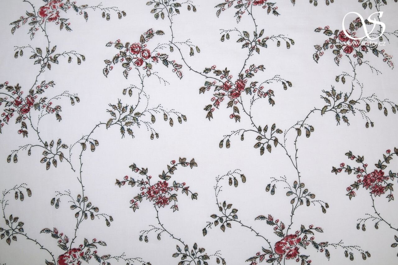 Jemný florální motiv této repliky je složen z kroucených stonků s trny a listy, na nichž jsou neseny svazky karafiátů, růží a dalších menších poupat a bobulí. Původní textilie je anglické či francouzské provenience a pochází z přelomu 18. a 19. století.