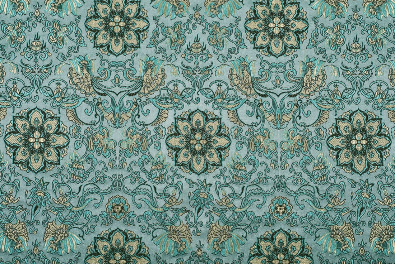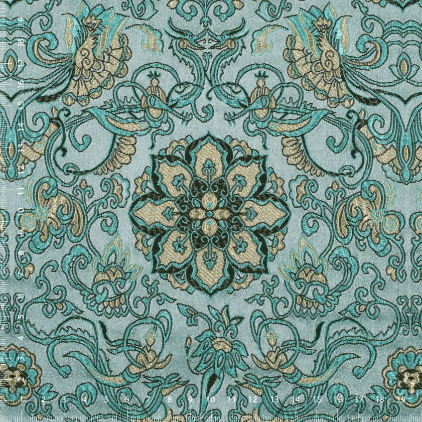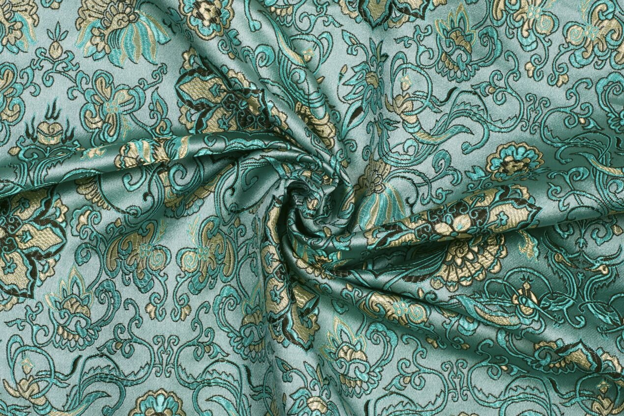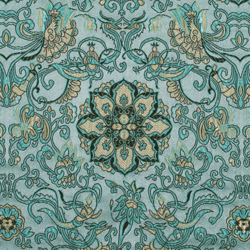 Luksusowa, solidna tkanina ze starannie utkanym wzorem w kolorze turkusowym. Brokat nadaje się na nierozciągliwe, dopasowane kroje lub ubrania, które mają zachować swój kształt, takie jak formalne sukienki i spódnice, gorsety, żakiety i marynarki. Nadaje się również na piękną torebkę, krawat lub muszkę, a także na dekoracyjną poszewkę na poduszkę lub zasłonę.