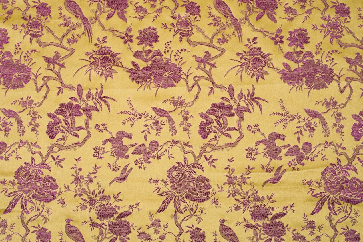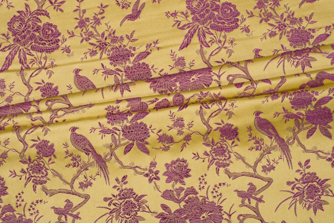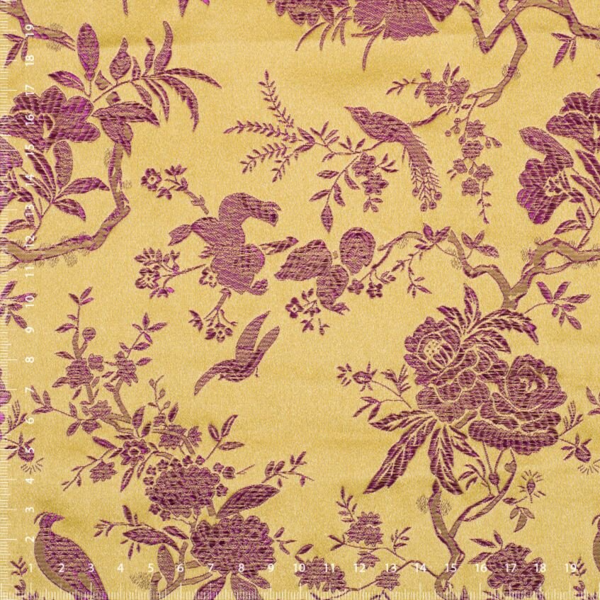 Luxusní pevná látka s pečlivě vytkávaným vzorem ve zlaté a fialové barvě. Brokát se hodí na nesplývavé, vypasované střihy nebo oděvy které mají držet tvar jako jsou společenské šaty a sukně, korzety, kabátky, saka a bundy. Ušijete z něj také krásnou kabelku, kravatu či motýlka nebo okrasný povlak na polštář či závěs.
