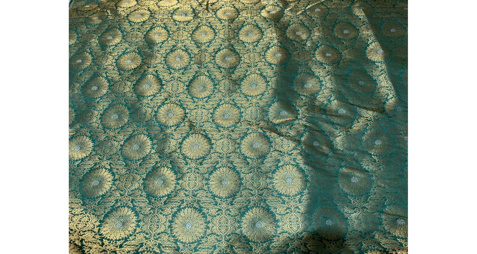 Ručně tkaná replika ze 14. století, utkaná z přírodního hedvábí a skutečných metalických nití. Zlatý vzor na smaragdovém pozadí. Hodí se nejen na šití historických kostýmů, ale i do luxusních interiérů a ozvláštnění současné módy.