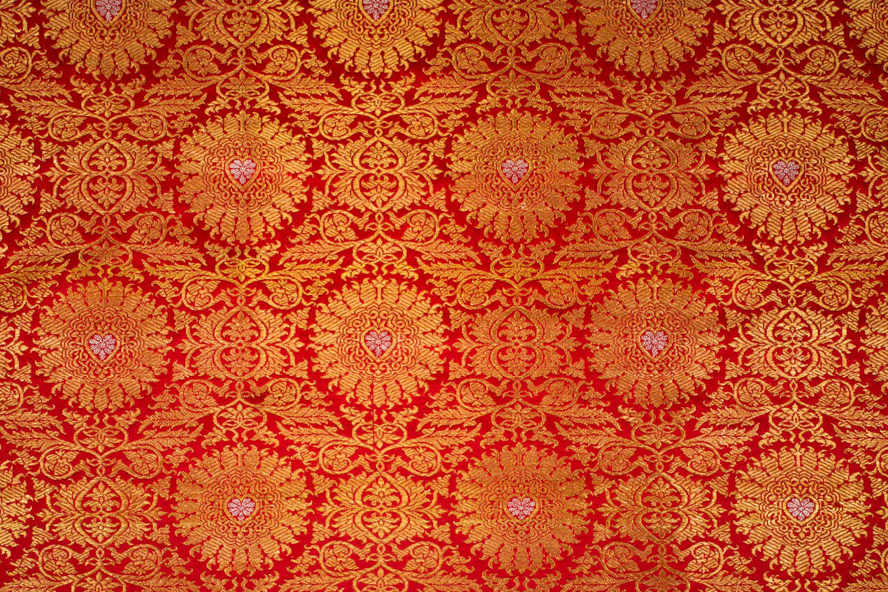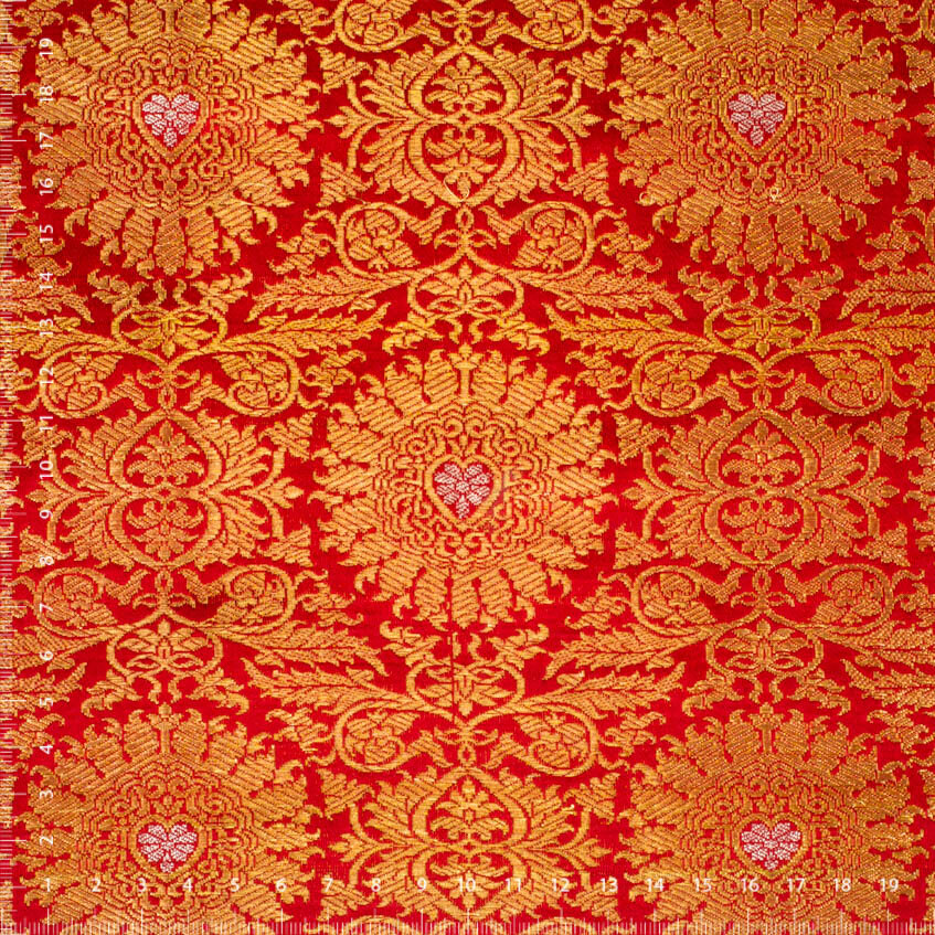 Ručně tkaná replika ze 14. století, utkaná z přírodního hedvábí a skutečných metalických nití. Zlatý vzor na červeném pozadí. Hodí se nejen na šití historických kostýmů, ale i do luxusních interiérů a ozvláštnění současné módy.