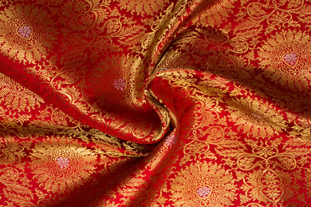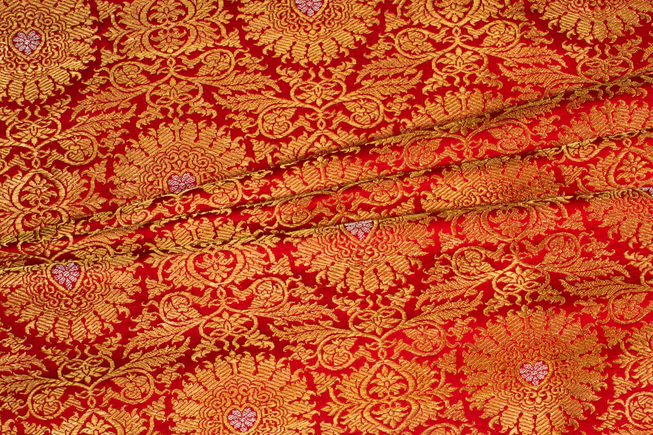 Tato replika historického brokátu je ručně tkaná žakárová látka z čistého hedvábí a skutečných kovových nití pozlacených pravým zlatem. Díky vysoce kvalitním materiálům je brokát nejen pevný, ale také měkký, jemný na dotek a prodyšný. Zlaté nitě nečernají ani neztrácejí svůj lesk.