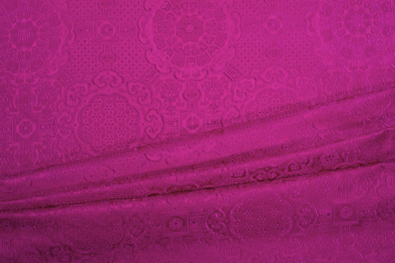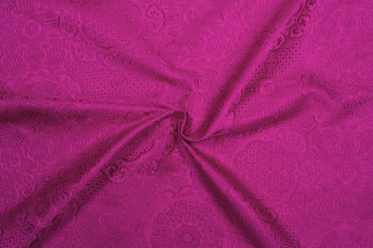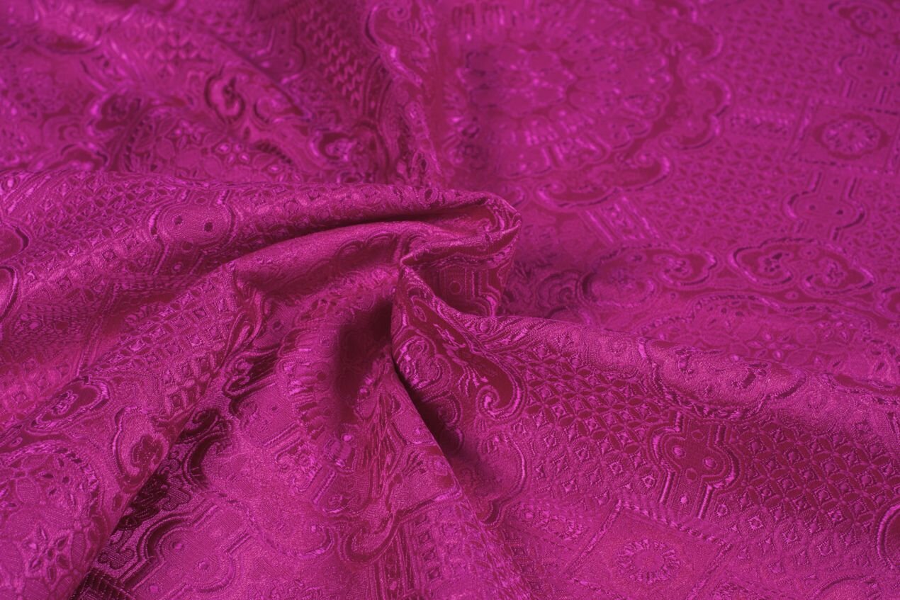 Luxusní pevná látka s pečlivě vytkávaným vzorem ve fuchsiové barvě. Brokát se hodí na nesplývavé, vypasované střihy nebo oděvy které mají držet tvar jako jsou společenské šaty a sukně, korzety, kabátky, saka a bundy. Ušijete z něj také krásnou kabelku, kravatu či motýlka nebo okrasný povlak na polštář či závěs.