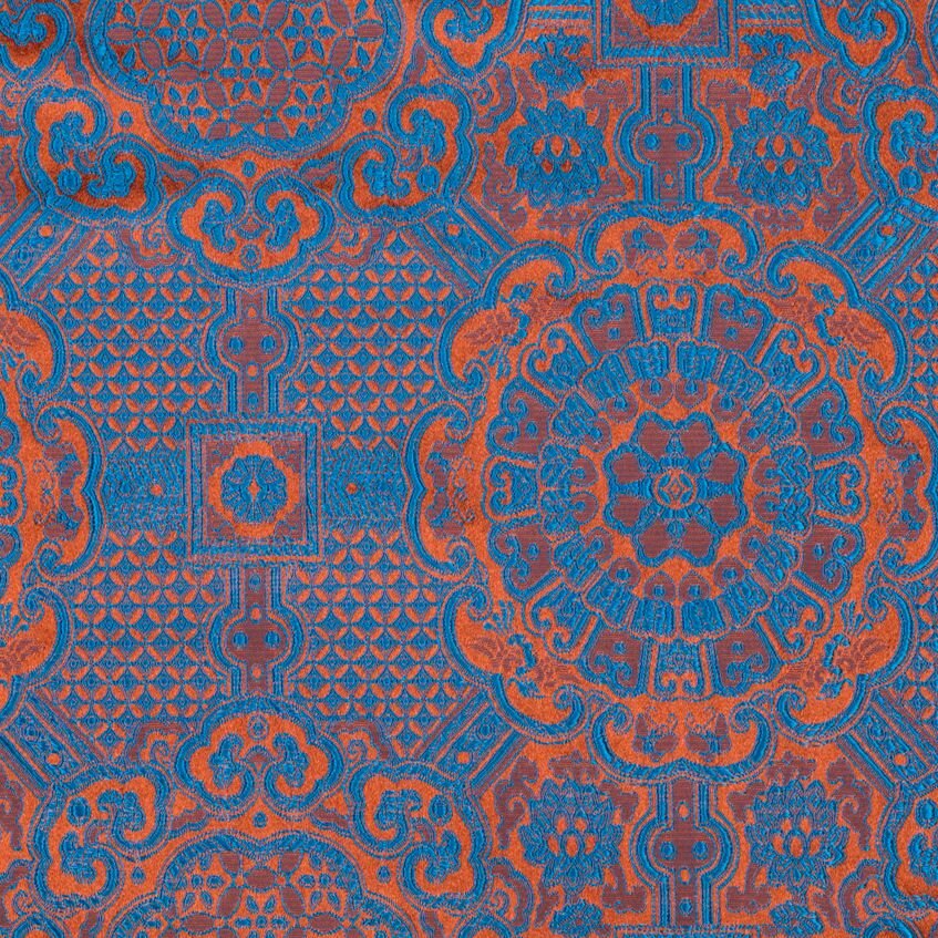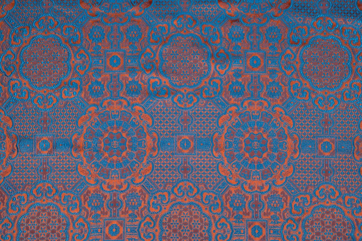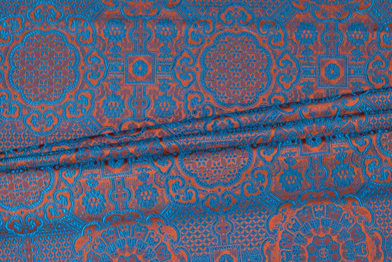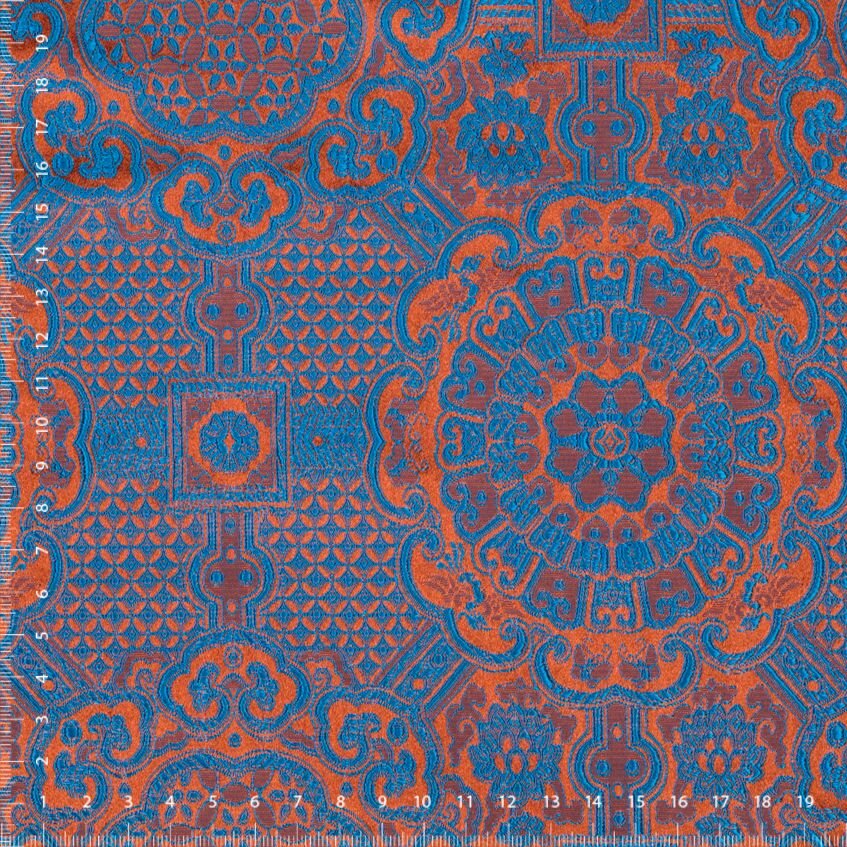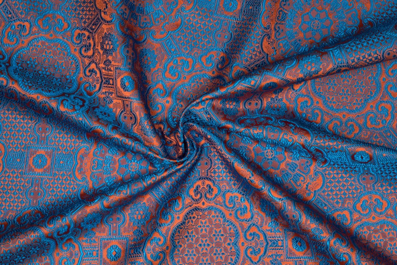 Luxusní pevná látka s pečlivě vytkávaným vzorem v modro-oranžové barvě. Brokát se hodí na nesplývavé, vypasované střihy nebo oděvy které mají držet tvar jako jsou společenské šaty a sukně, korzety, kabátky, saka a bundy. Ušijete z něj také krásnou kabelku, kravatu či motýlka nebo okrasný povlak na polštář či závěs.