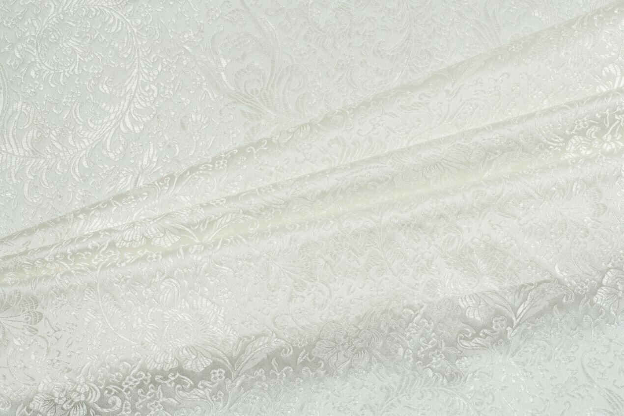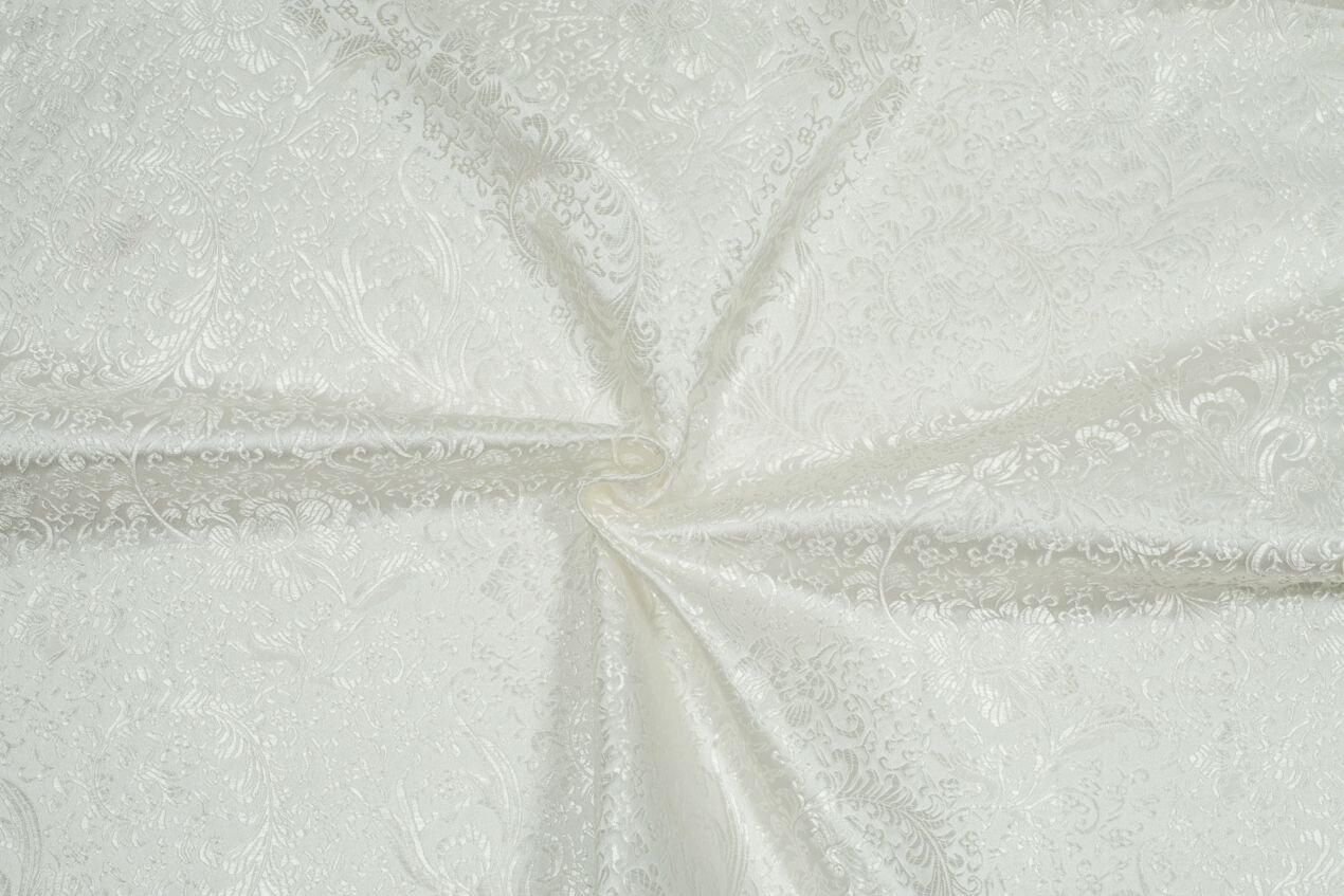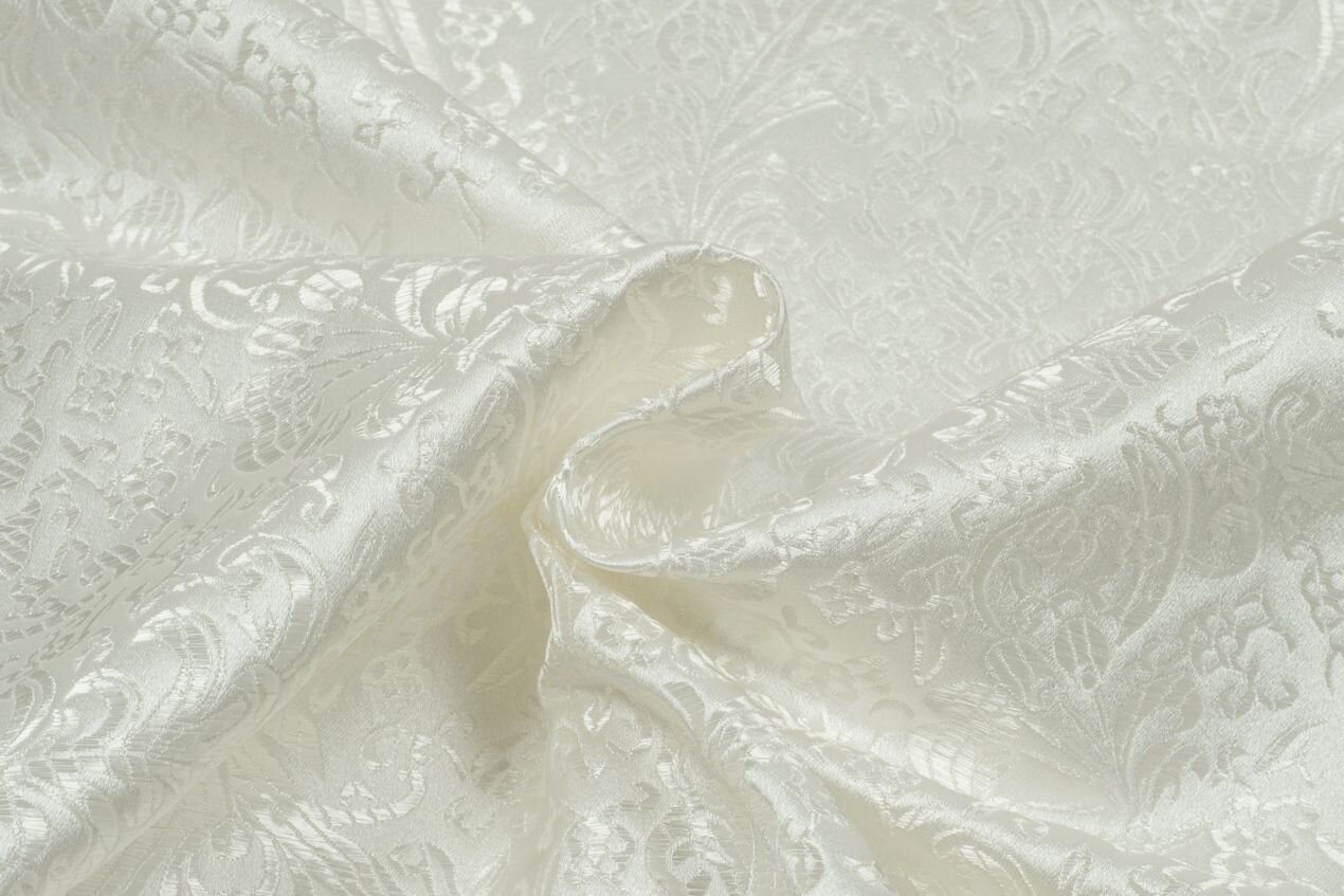 Luxusní pevná látka s pečlivě vytkávaným vzorem v ivory barvě. Brokát se hodí na nesplývavé, vypasované střihy nebo oděvy které mají držet tvar jako jsou společenské šaty a sukně, korzety, kabátky, saka a bundy. Ušijete z něj také krásnou kabelku, kravatu či motýlka nebo okrasný povlak na polštář či závěs.