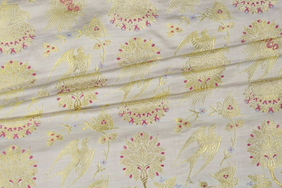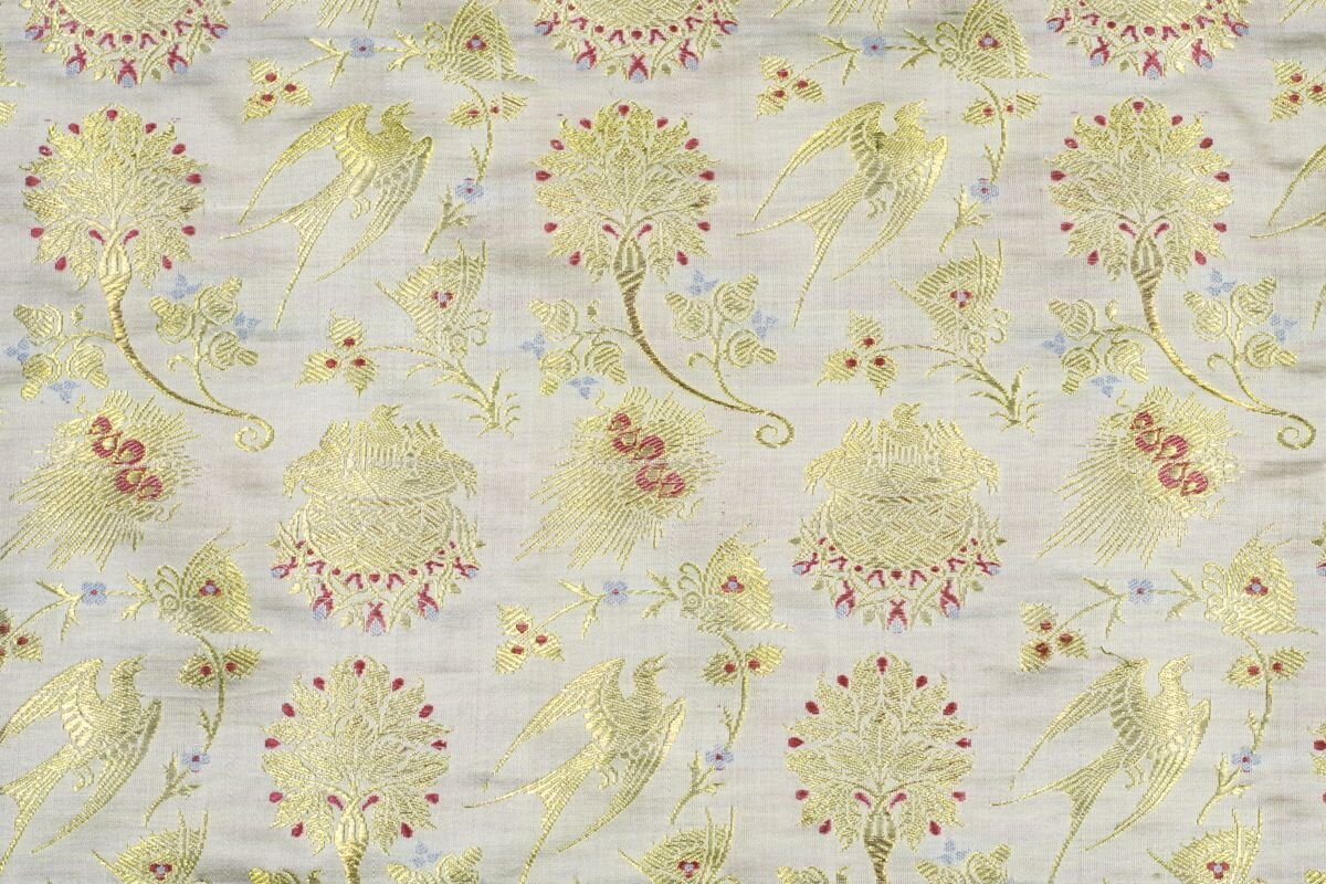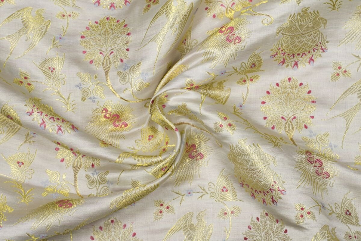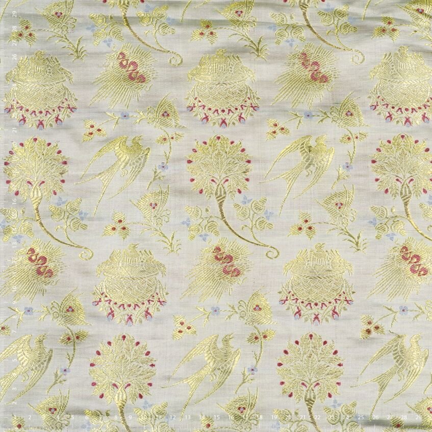 Textilie je tvořena vysoce kvalitními materiály. Jde o čisté hedvábí doplněné kovovými nitěmi pozlacenými skutečným zlatem! Nejedná se o běžně dostupný lurex, který je pouhou imitací zlatých nití. Díky vysoce kvalitním metalickým nitím je tkanina měkčí, jemnější a prodyšnější a zlaté vytkávání neztratí ani po čase svůj lesk. Z rubu jsou zlaté nitě volné, proto doporučujeme podšívku. Nabízíme ve vínové a modré variantě.