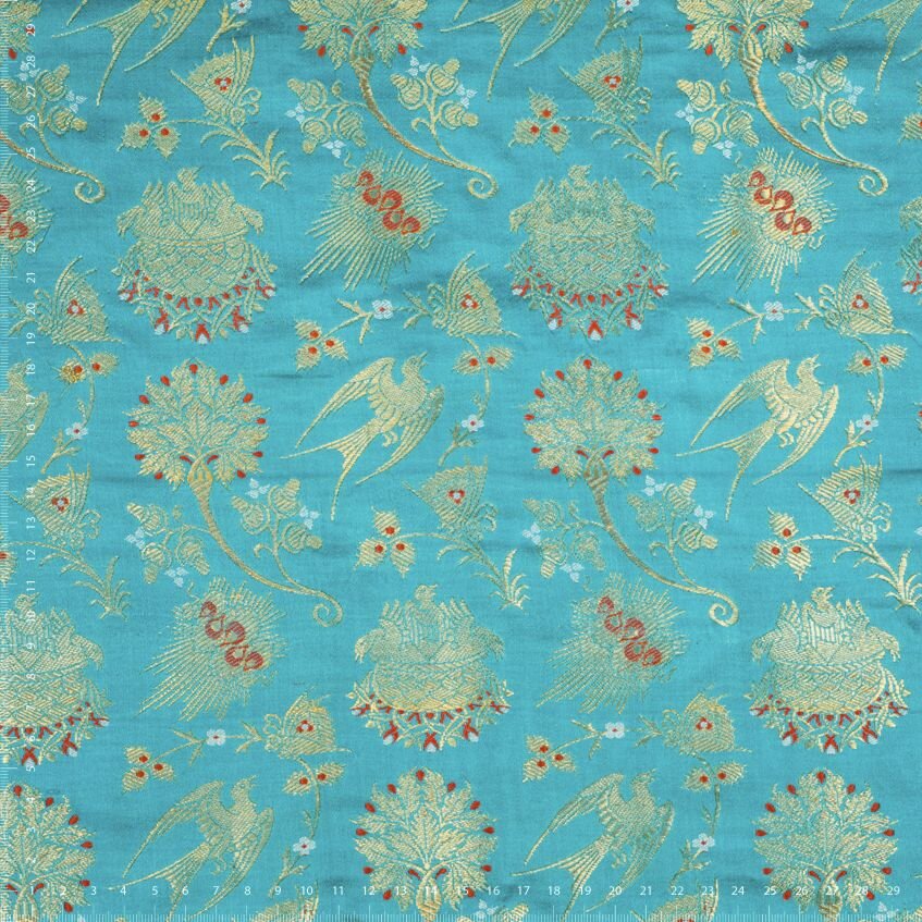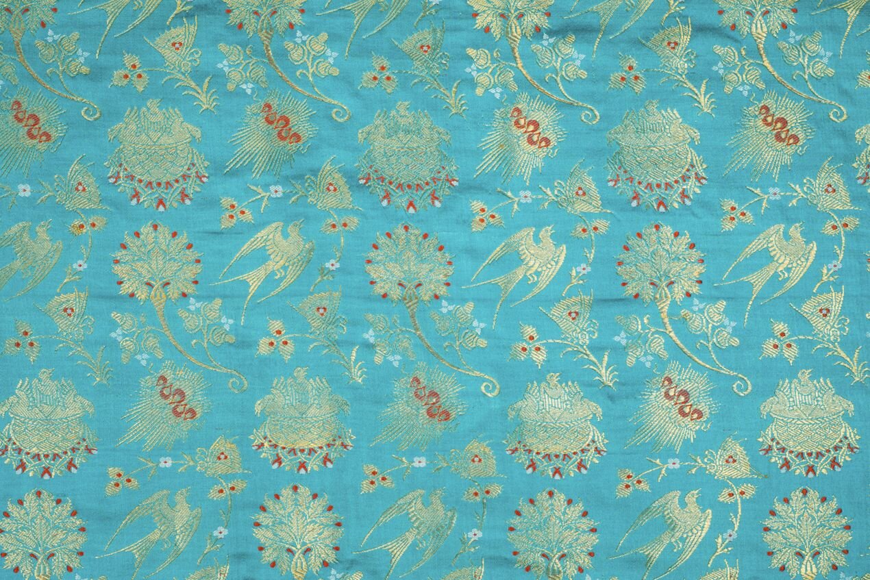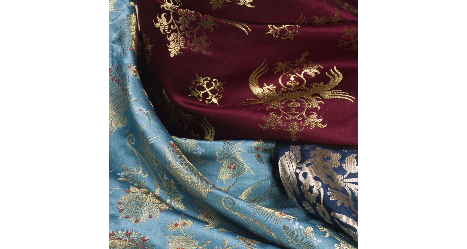 Textilie je tvořena vysoce kvalitními materiály. Jde o čisté hedvábí doplněné kovovými nitěmi pozlacenými skutečným zlatem! Nejedná se o běžně dostupný lurex, který je pouhou imitací zlatých nití. Díky vysoce kvalitním metalickým nitím je tkanina měkčí, jemnější a prodyšnější a zlaté vytkávání neztratí ani po čase svůj lesk. Z rubu jsou zlaté nitě volné, proto doporučujeme podšívku. Nabízíme ve vínové a modré variantě.
