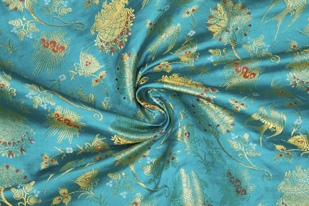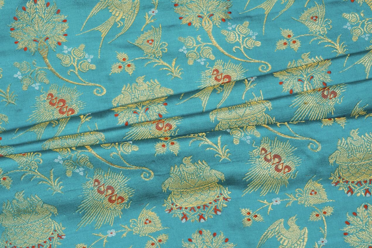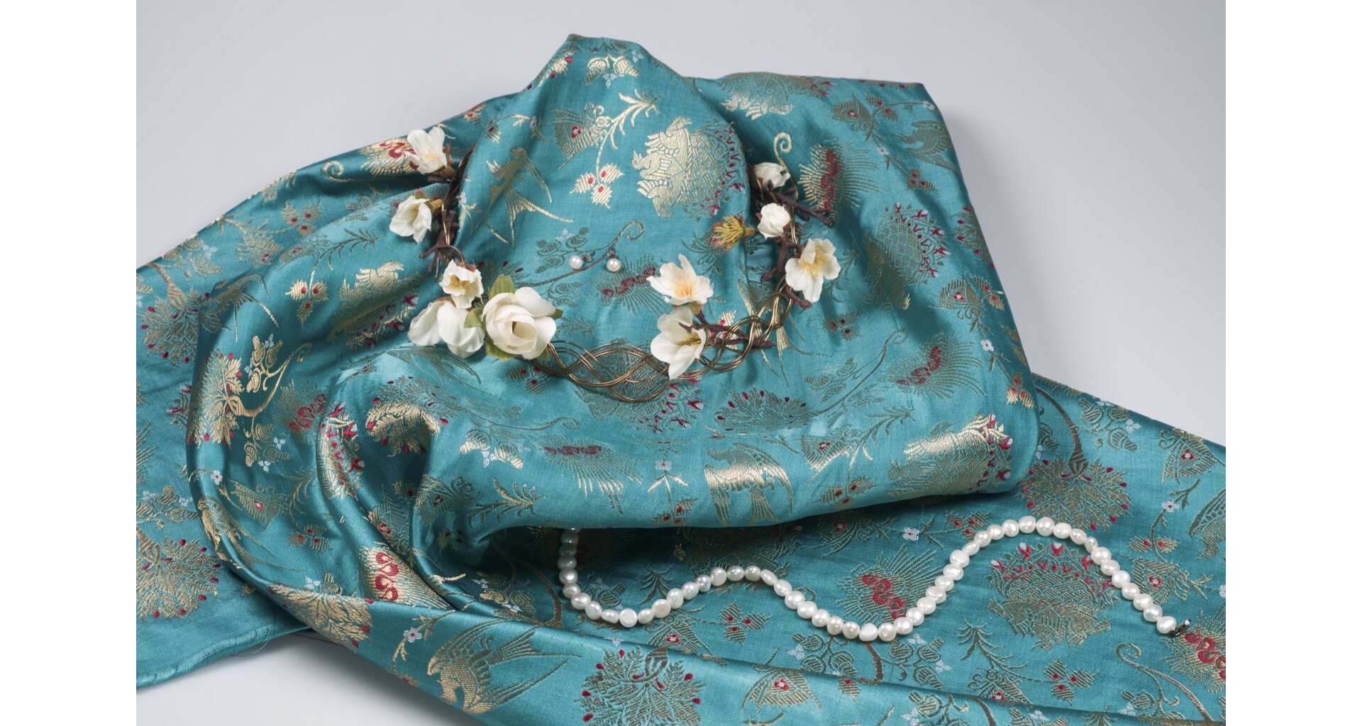 Textilie je tvořena vysoce kvalitními materiály. Jde o čisté hedvábí doplněné kovovými nitěmi pozlacenými skutečným zlatem! Nejedná se o běžně dostupný lurex, který je pouhou imitací zlatých nití. Díky vysoce kvalitním metalickým nitím je tkanina měkčí, jemnější a prodyšnější a zlaté vytkávání neztratí ani po čase svůj lesk. Z rubu jsou zlaté nitě volné, proto doporučujeme podšívku. Nabízíme ve vínové a modré variantě.