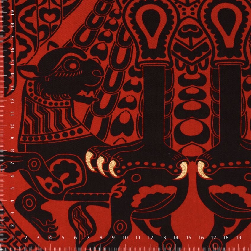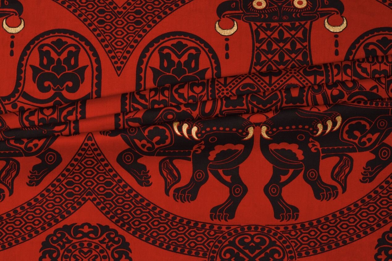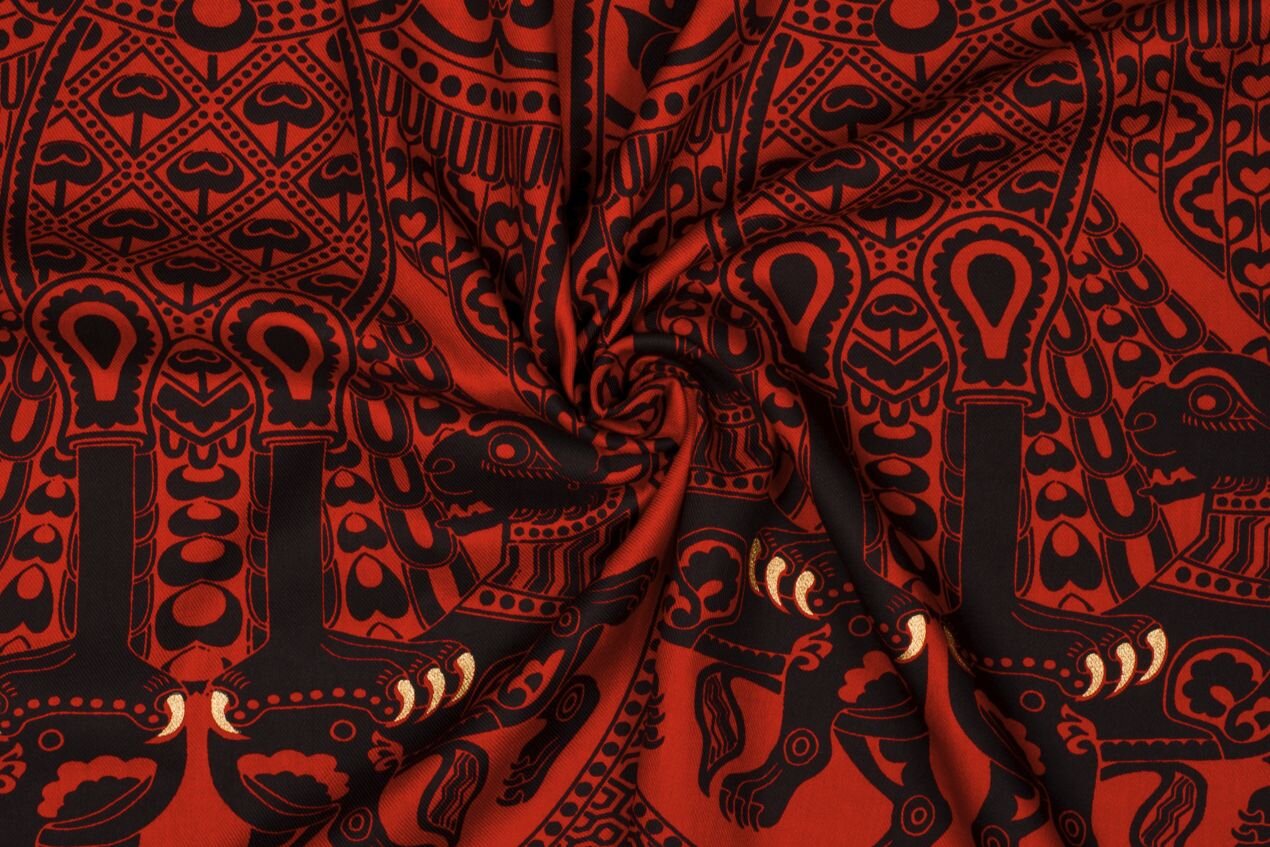 Tento potištěný hedvábný serž se díky věrnému historickému potisku samozřejmě skvěle hodí na historické kostýmy nebo fantasy šaty.