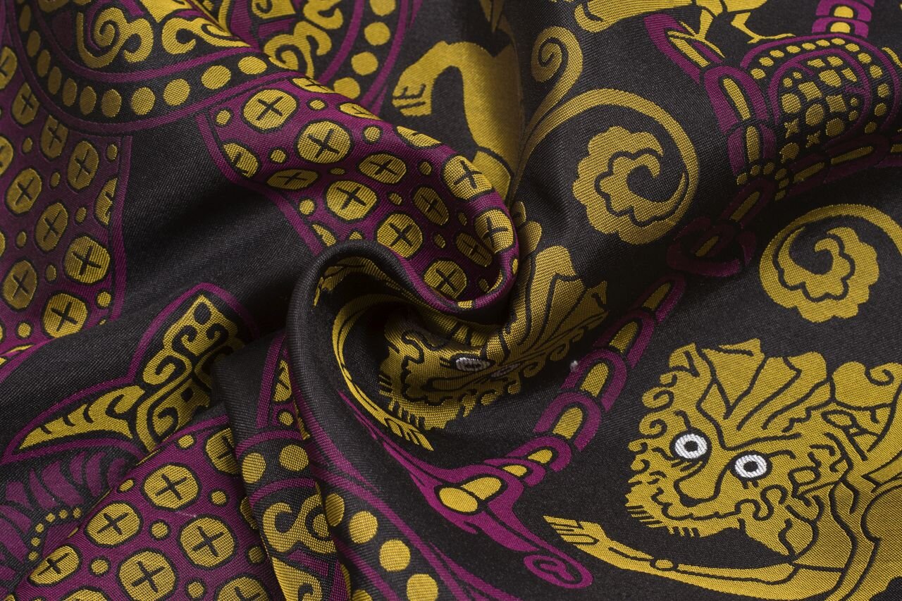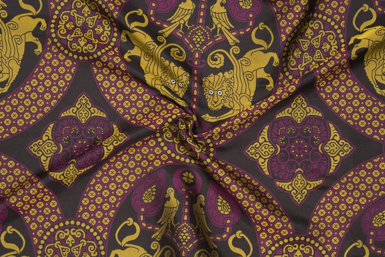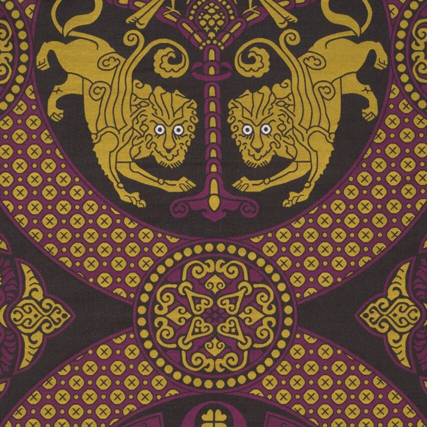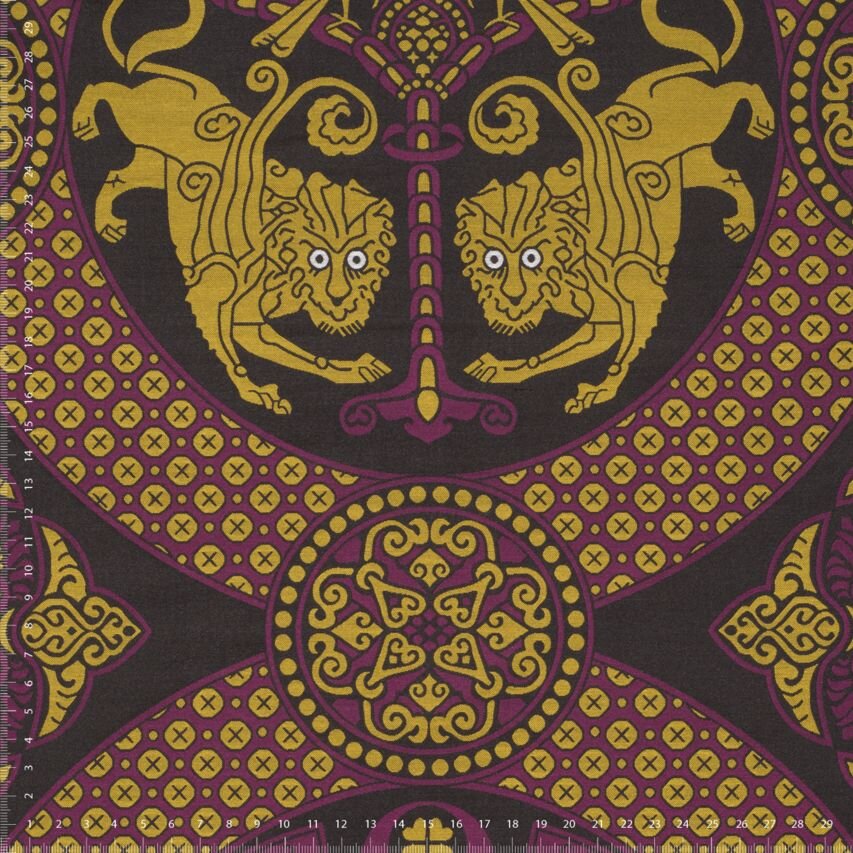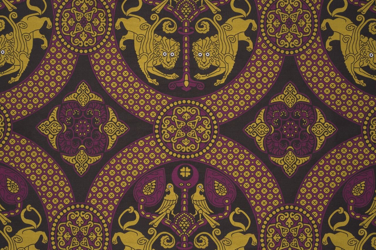 Předlohou této repliky tkané z čistého hedvábí byla byzantská látka ze 12. století. Látka má zlato purpurový vzor na černém pozadí. Hodí se nejen na šití historických kostýmů, ale i do luxusních interiérů a ozvláštnění současné módy.