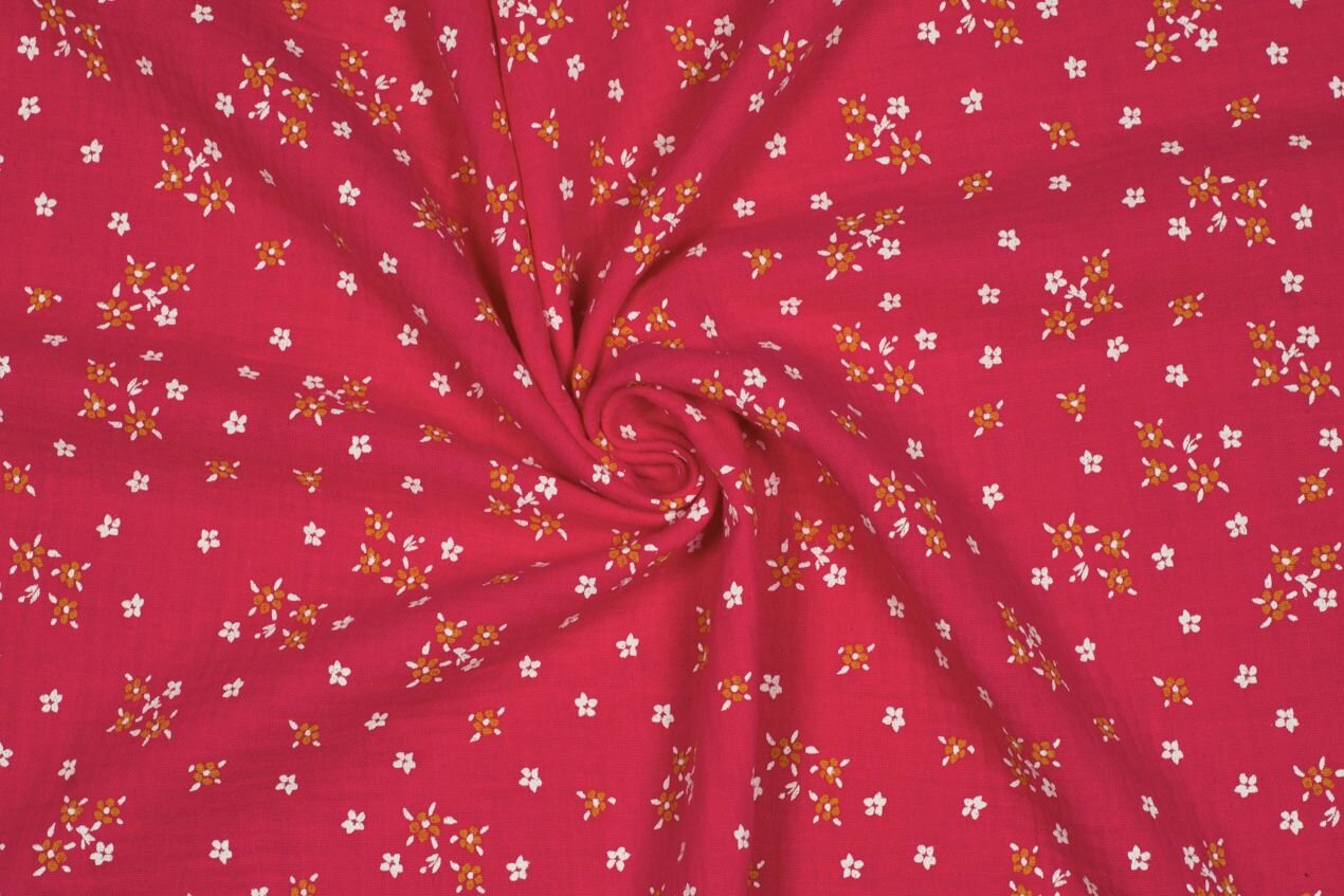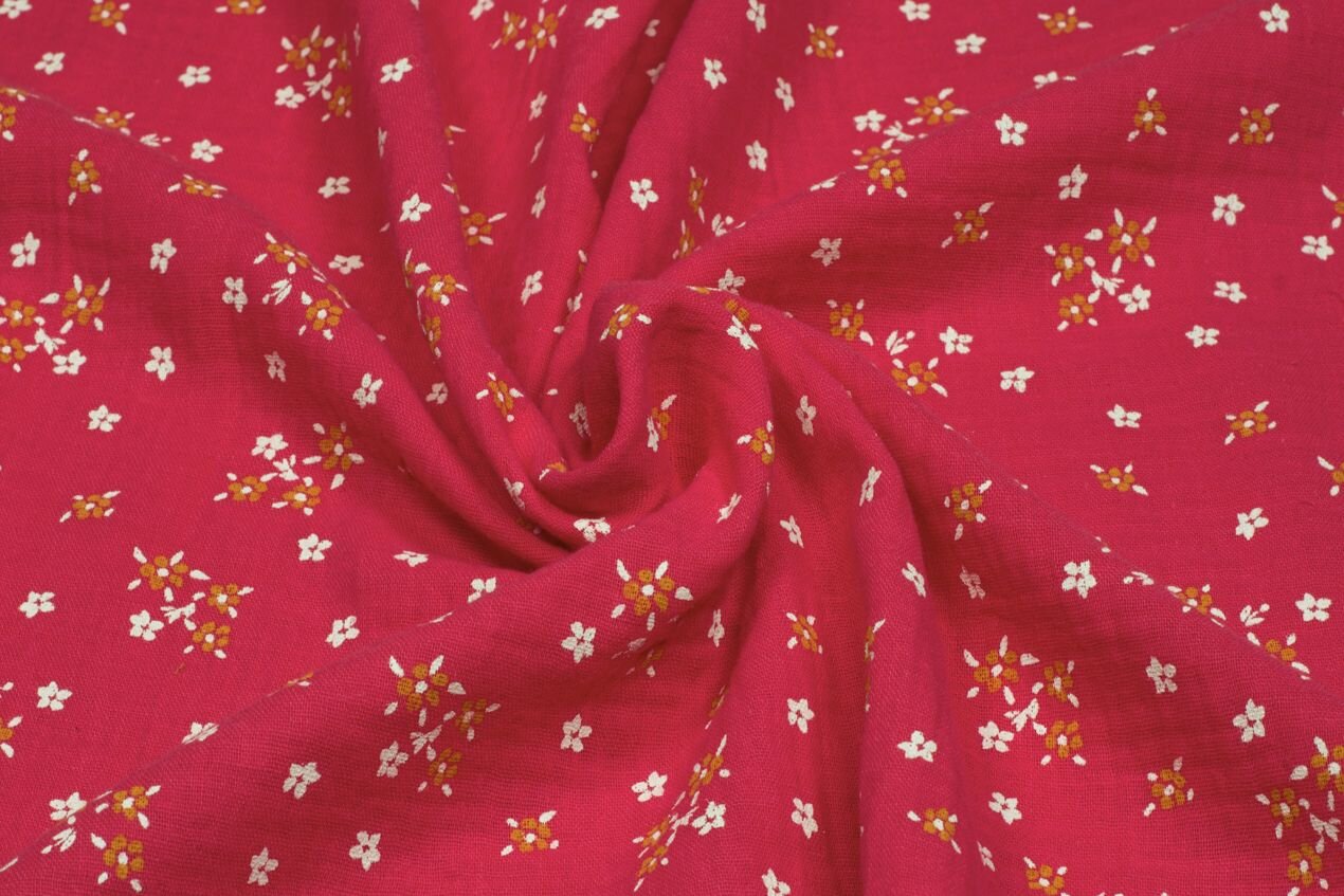 Dvojitá gázovina z kvalitní 100% bavlny v bio kvalitě a s certifikátem pro děti do tří let v sytě růžové barvě s drobným květinovým potiskem. Oblíbený měkoučký materiál na pohodlné šaty, kalhoty nebo oblečení pro děti.