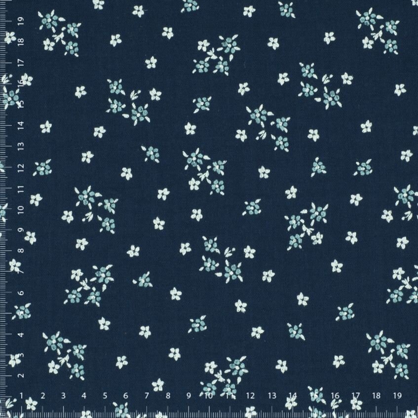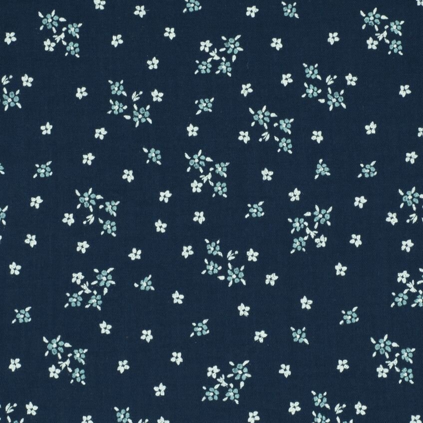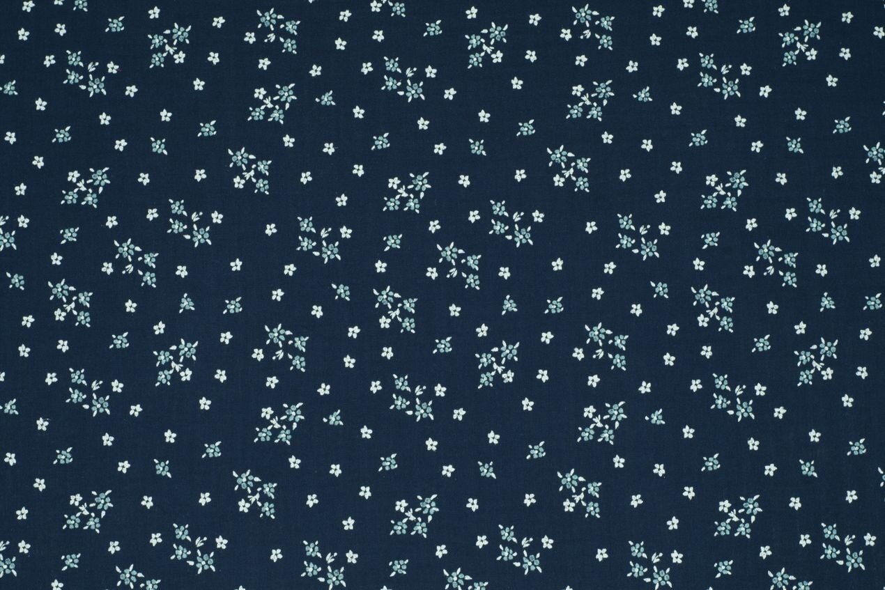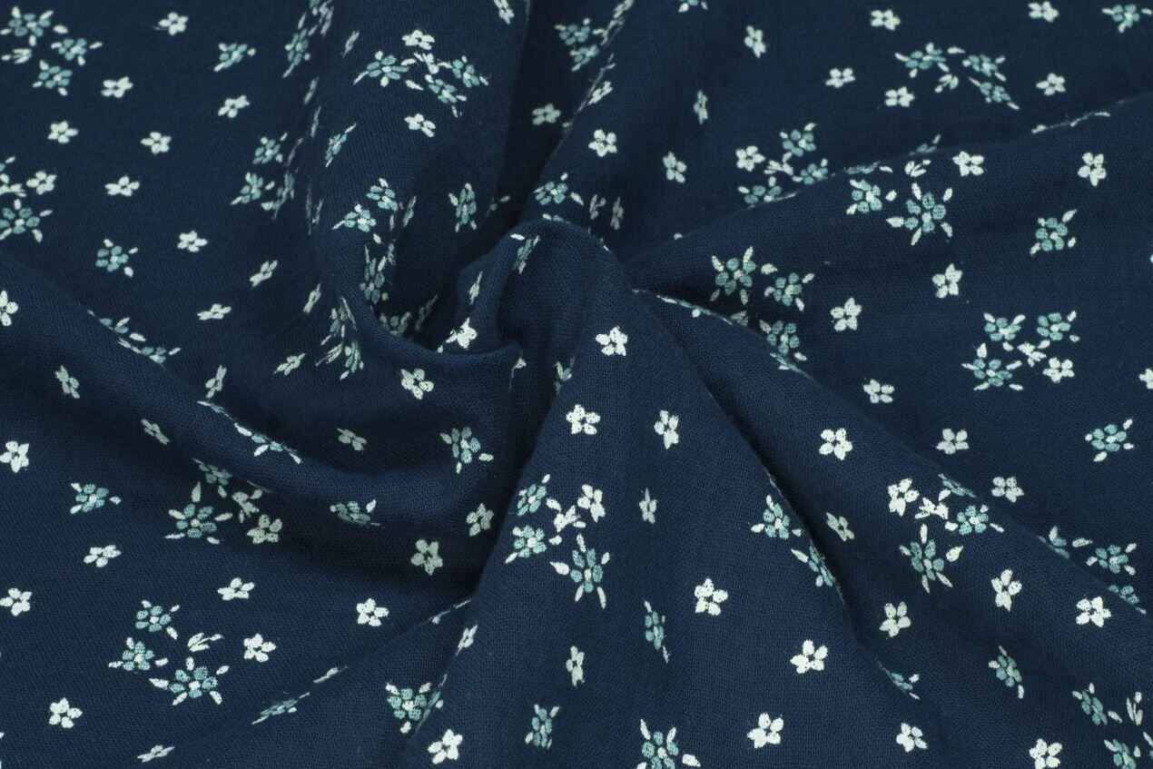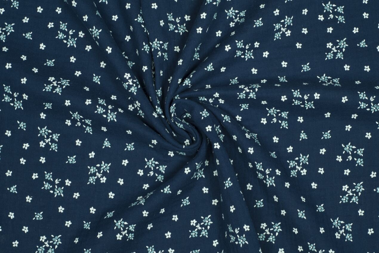 Dvojitá gázovina z kvalitní 100% bavlny v bio kvalitě a s certifikátem pro děti do tří let v tmavě modré barvě s drobným květinovým potiskem. Oblíbený měkoučký materiál na pohodlné šaty, kalhoty nebo oblečení pro děti.