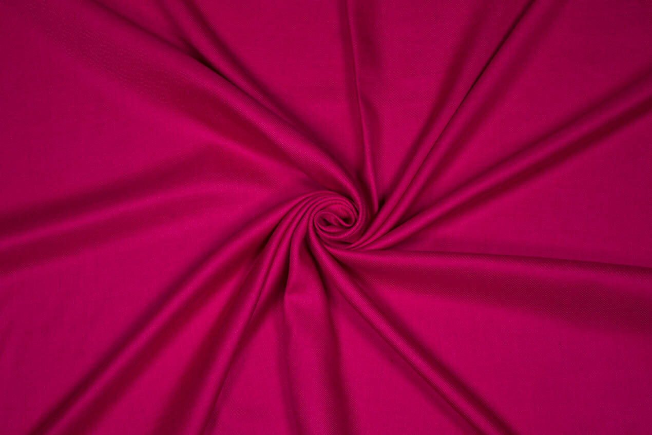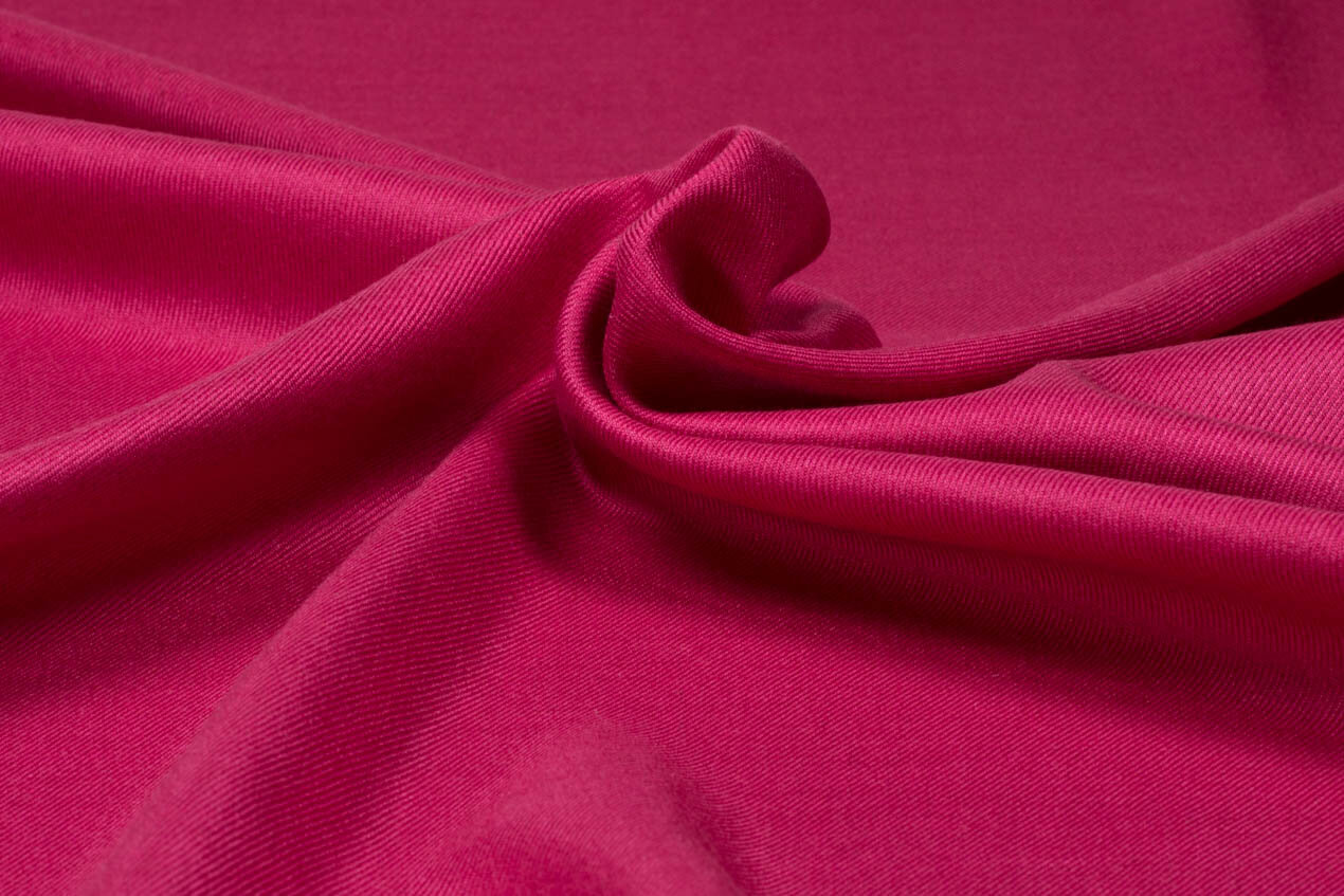 Miękka, gładka malinowa tkanina z naturalnego dzikiego jedwabiu eri tkana popularnym splotem skośnym tworzącym drobne ukośne paski. Można z niej szyć niezwykłe bluzki, tuniki, spódnice i sukienki.