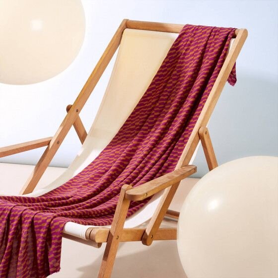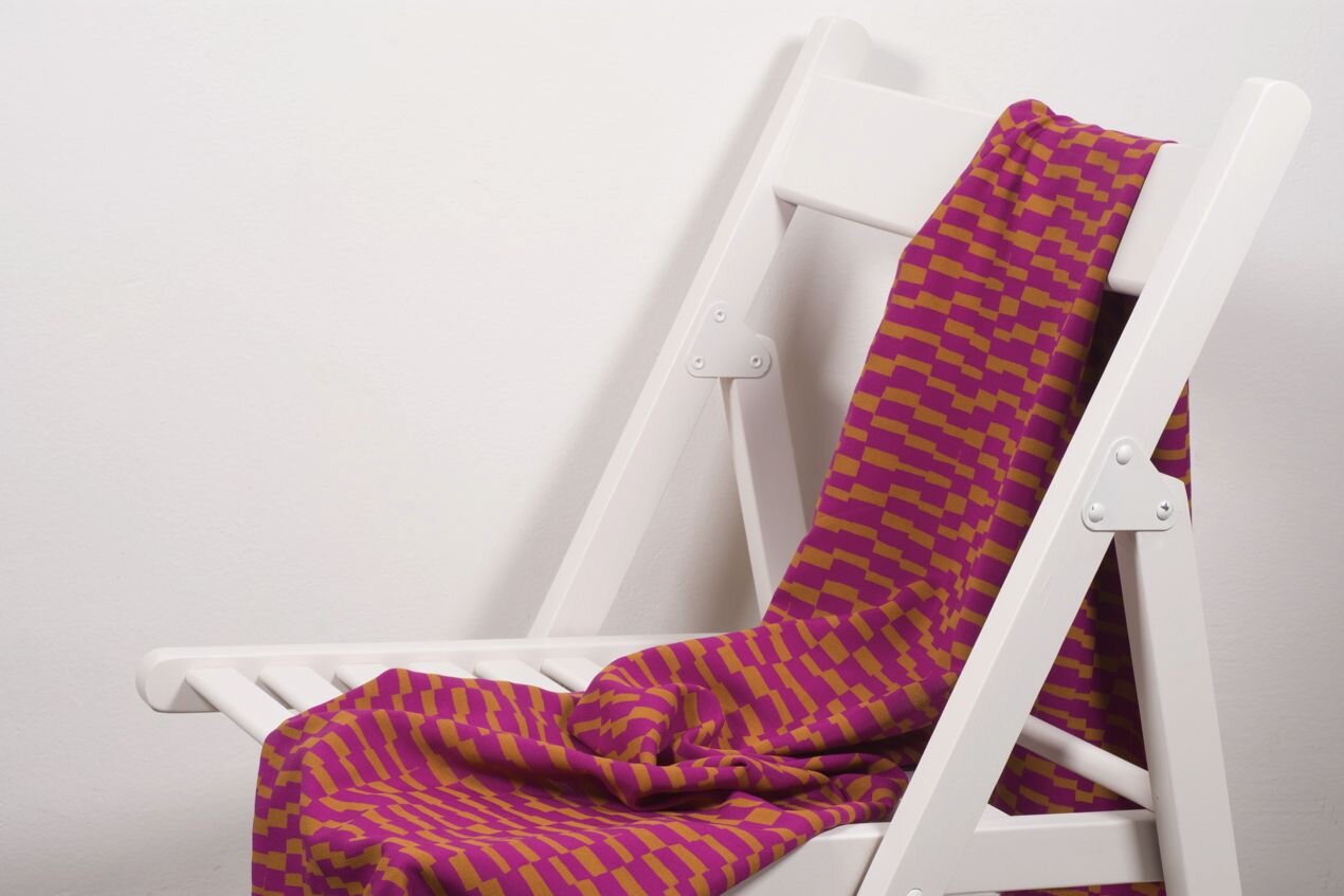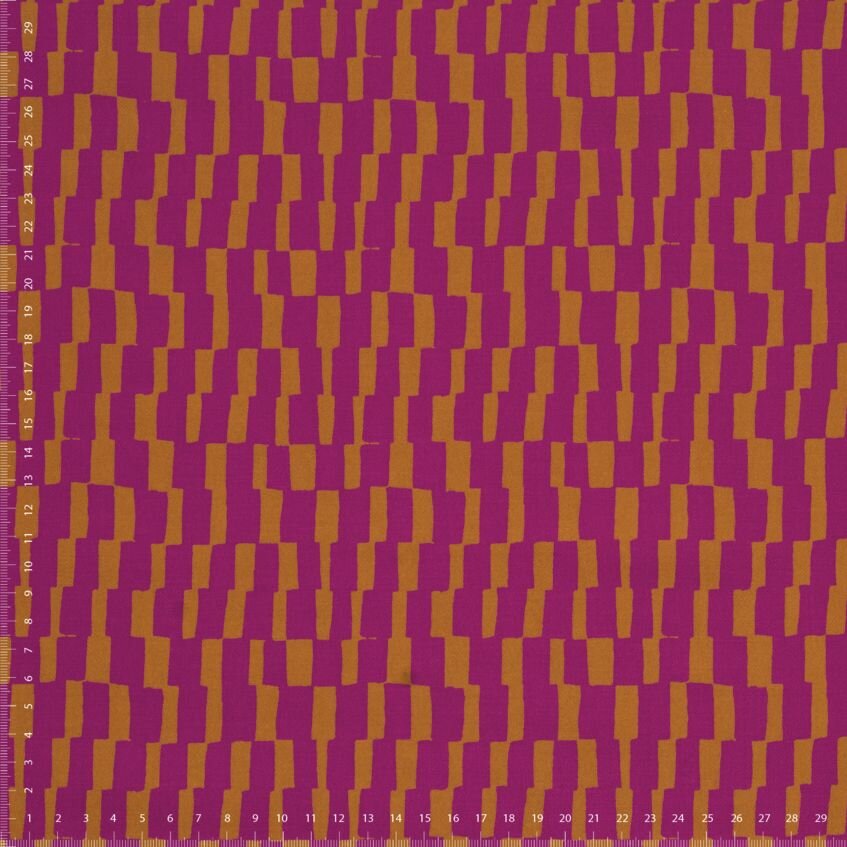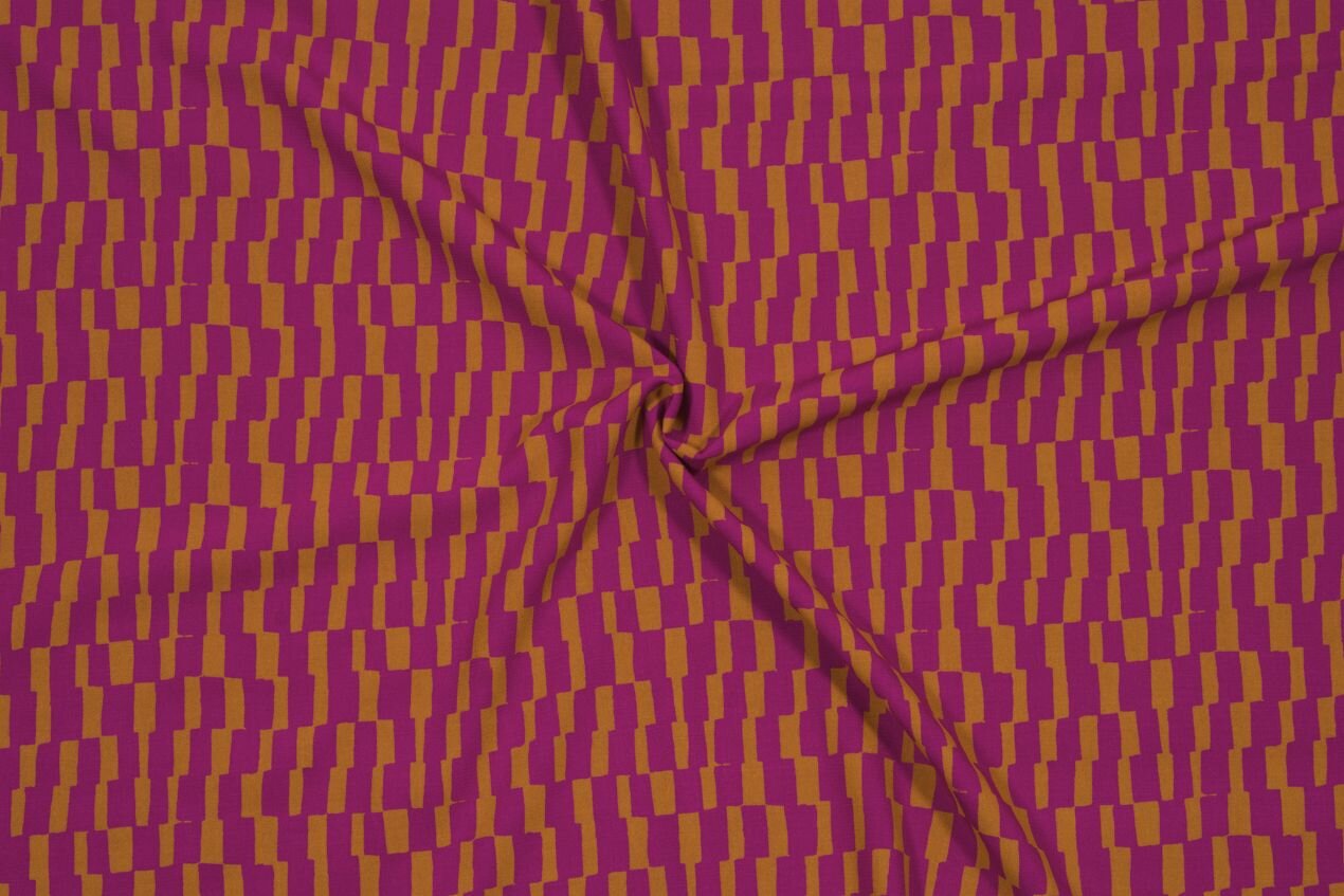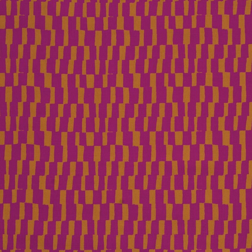 Vzor Domino Dahlia je inspirován dominem. Kostičky, s nimiž si vyhrají děti i dospělí, dostaly rozcuchanější podobu, ale zůstaly seřazené hezky za sebou; vzor můžete využít ve svislé i vodorovné poloze k optickým kouzlům se střihem. Kombinace zlatého okru a fuchsiové – tedy, v tomto případě jiřinové („dahlia“ je anglicky jiřina) – je nezvyklá, ale obě barvy spolu skvěle ladí. Nemůžete se rozhodnout, jestli geometrii nebo abstrakci, neutrální nebo výrazný odstín? A co takhle obojí najednou?