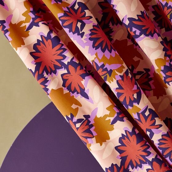 Potisk Maple ve skořicové, růžové, tmavě modré evokuje pocit luxusu. Béžová barva v tomto potisku slouží jako neutrální základ, který všechny ostatní tóny harmonicky propojuje.