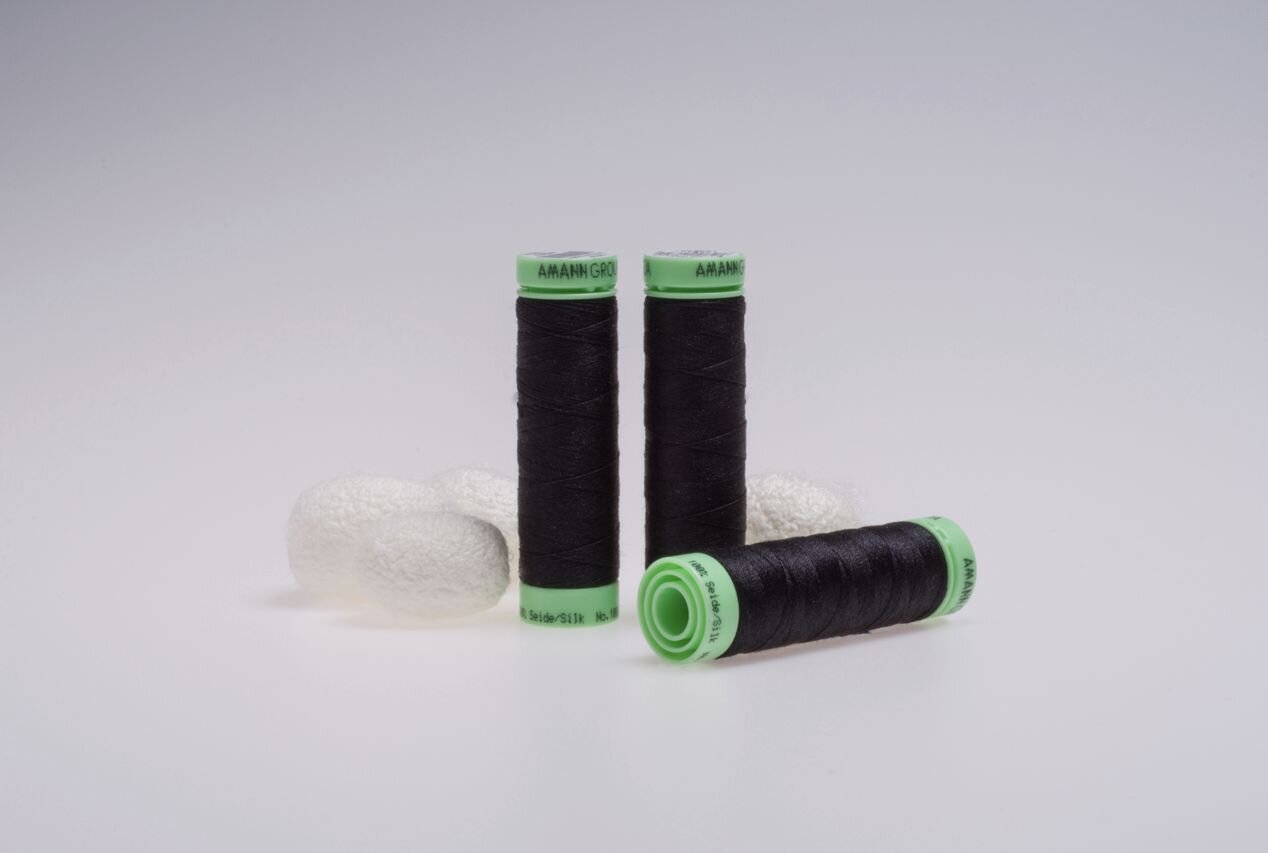 Pevná nit ze 100% přírodního hedvábí na ruční i strojové šití tloušťkou podobná běžným nitím v černé barvě.