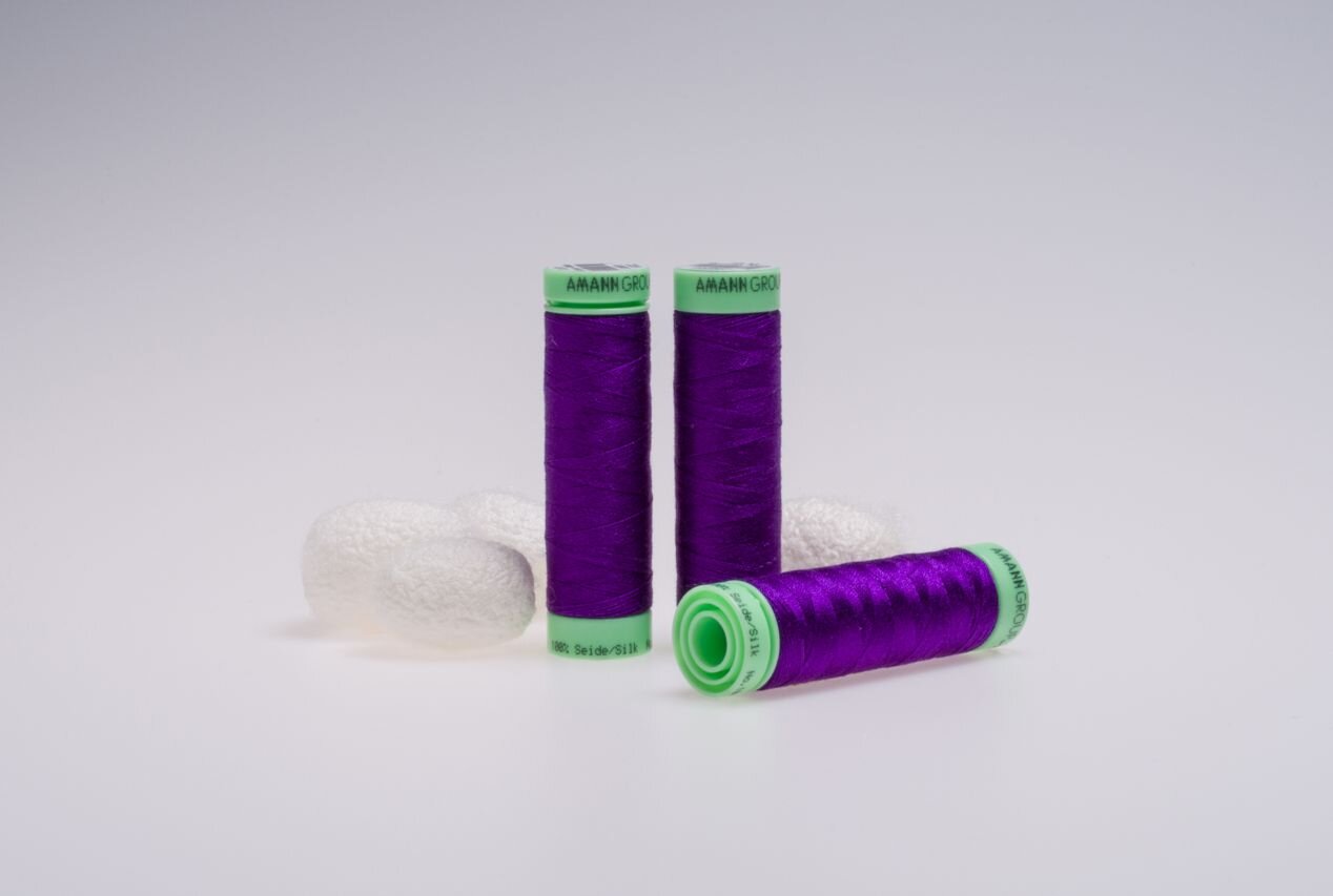 Pevná nit ze 100% přírodního hedvábí na ruční i strojové šití tloušťkou podobná běžným nitím ve fialové barvě.