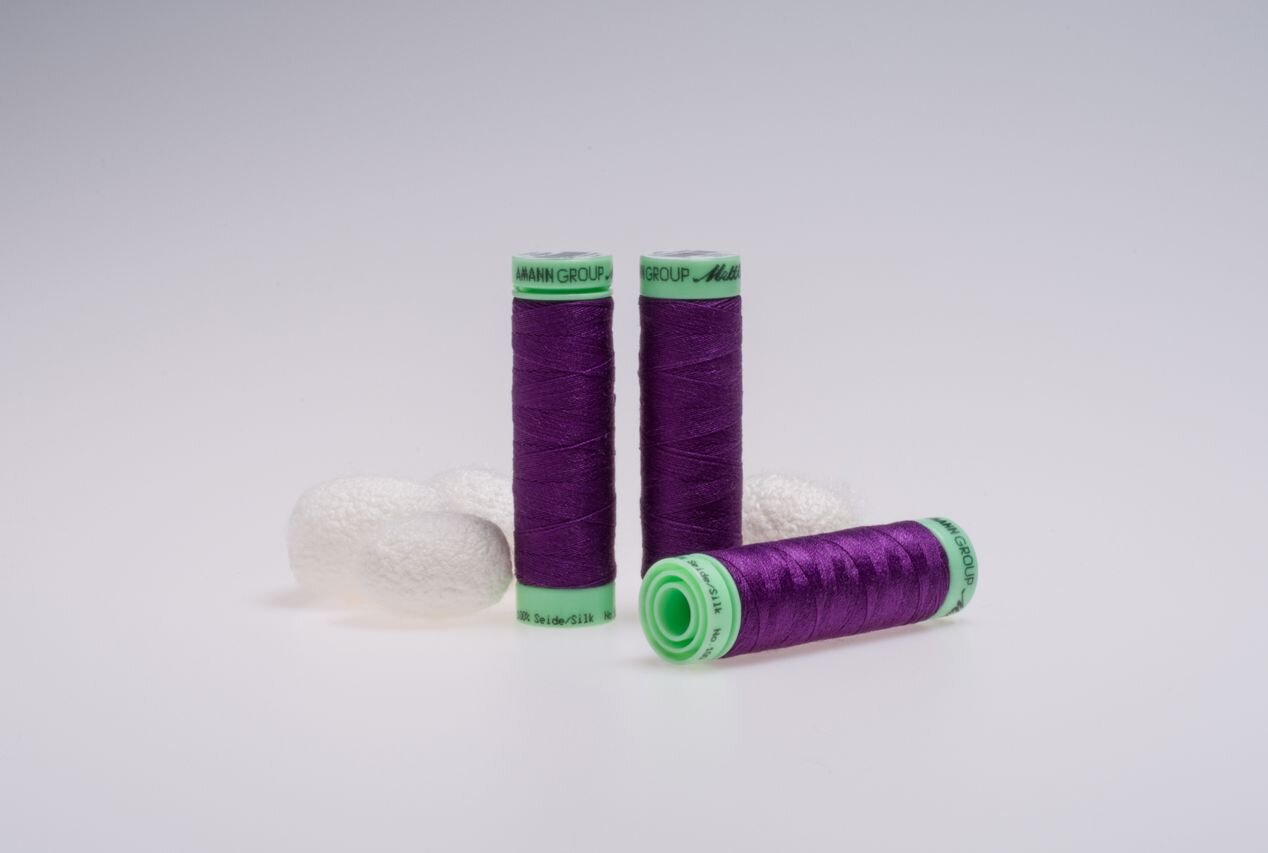 Pevná nit ze 100% přírodního hedvábí na ruční i strojové šití tloušťkou podobná běžným nitím ve fialové barvě.