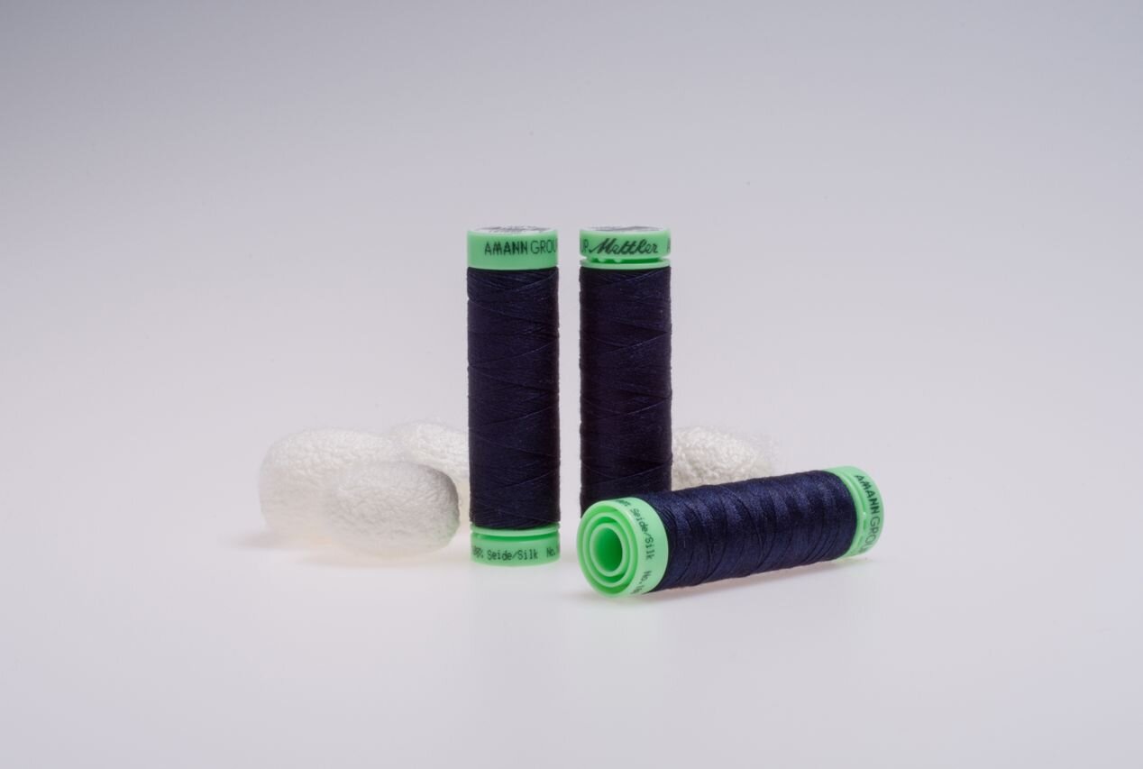 Pevná nit ze 100% přírodního hedvábí na ruční i strojové šití tloušťkou podobná běžným nitím v tmavě modré barvě.