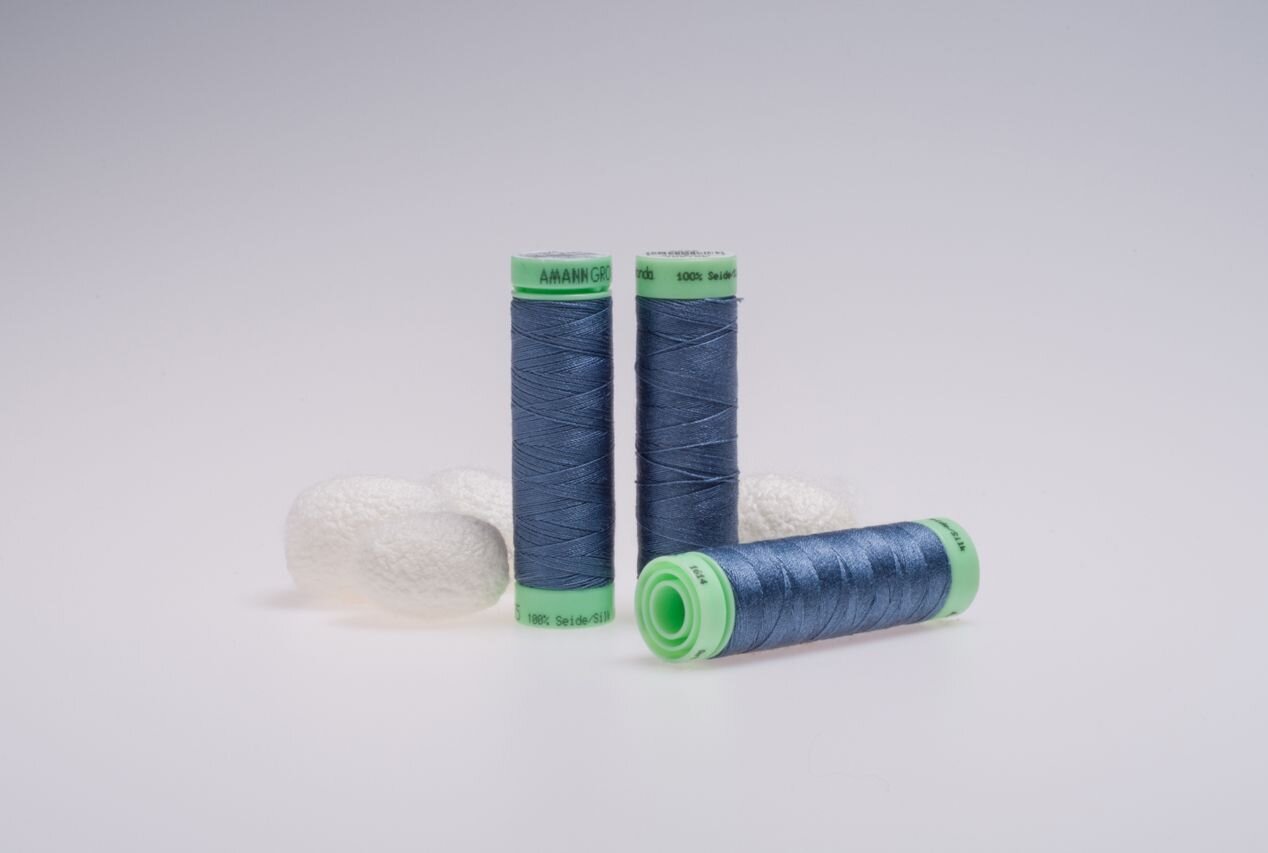 Pevná nit ze 100% přírodního hedvábí na ruční i strojové šití tloušťkou podobná běžným nitím v denim barvě.