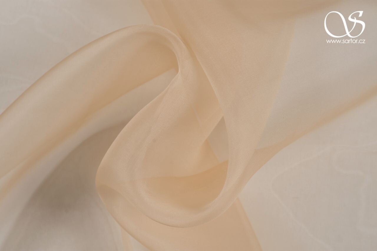 V porovnání s běžnou umělou organzou je tato hedvábná organza v meruňkové barvě matná a působí elegantnějším, luxusnějším dojmem. Potřebujete-li mírně lesklejší variantu, doporučujeme saténovou organzu.