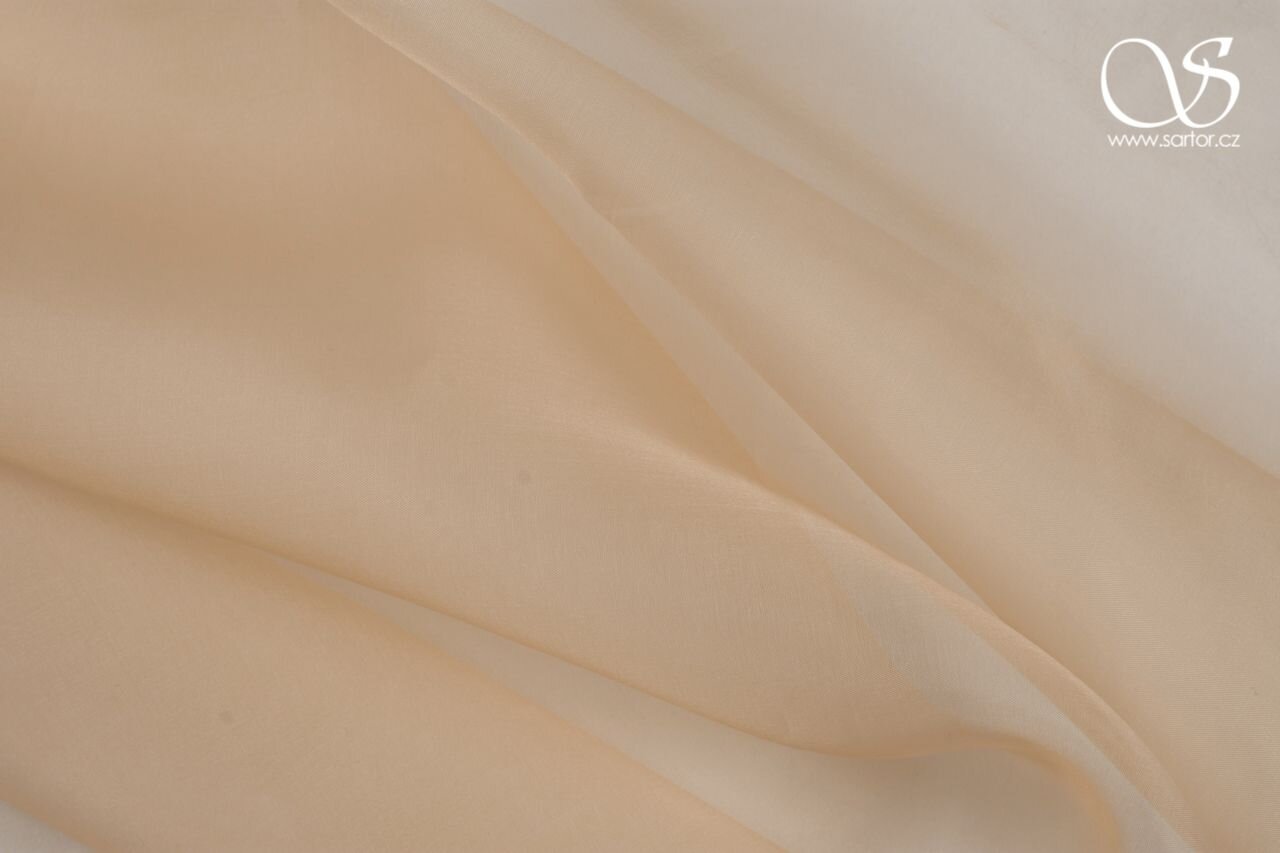 Lehká, průhledná, matná a tuhá látka z čistého hedvábí. Tato organza v meruňkové barvě se výborně se hodí na vzdušné nabírané sukně a rukávy, jako podklad pod výšivky a aplikace, ale i na elegantní záclony.