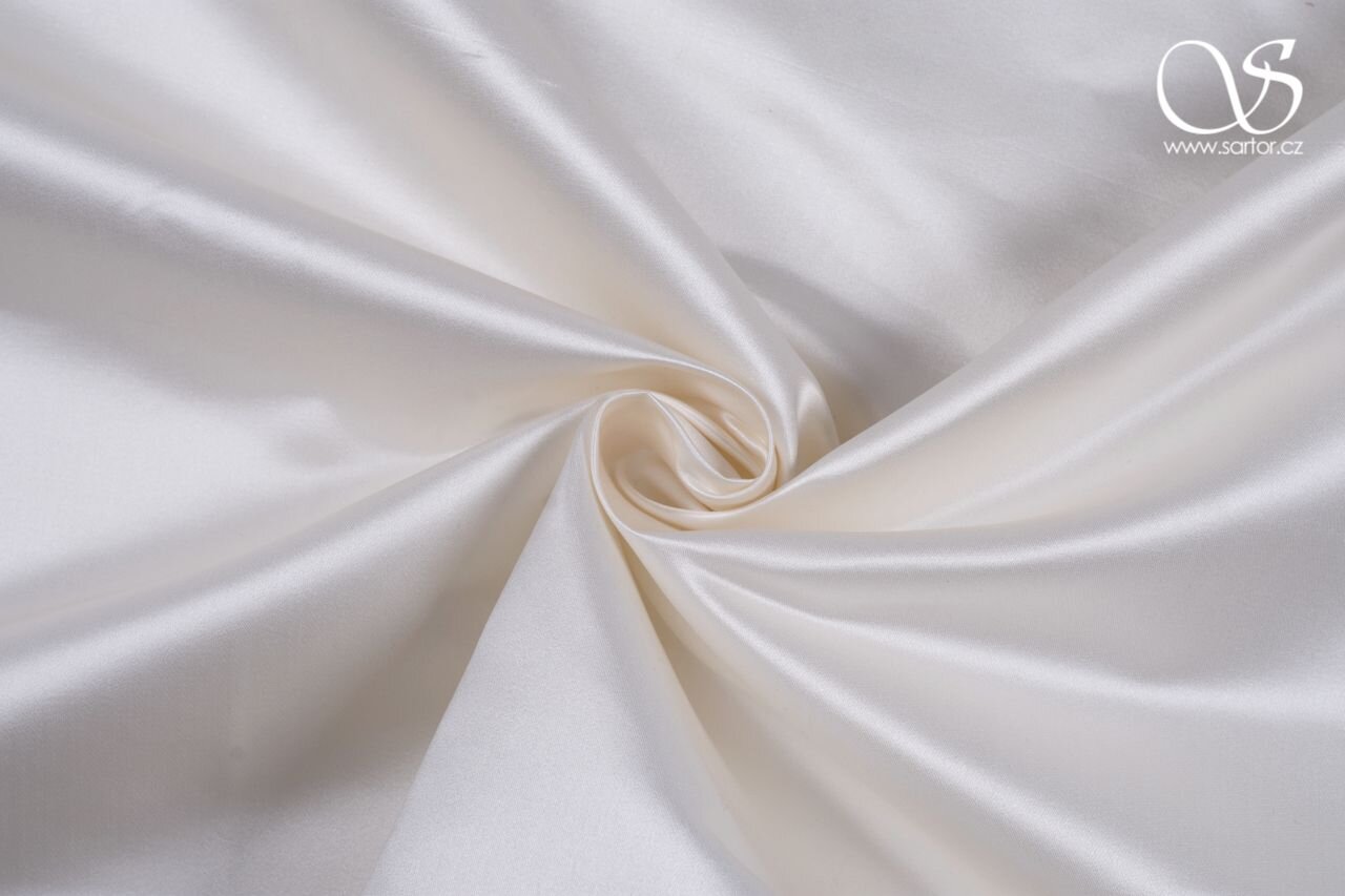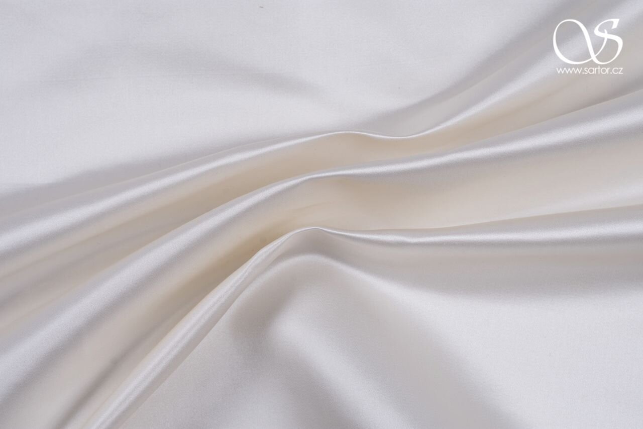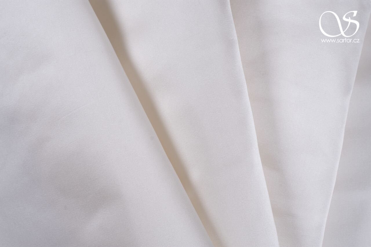 Těžká, matně lesklá látka z přírodního hedvábí skutečně luxusního vzhledu v neutrálním odstínu bílé. Skvělá látka na svatební a společenské šaty, popřípadě na korzety, sukně či kabátky.