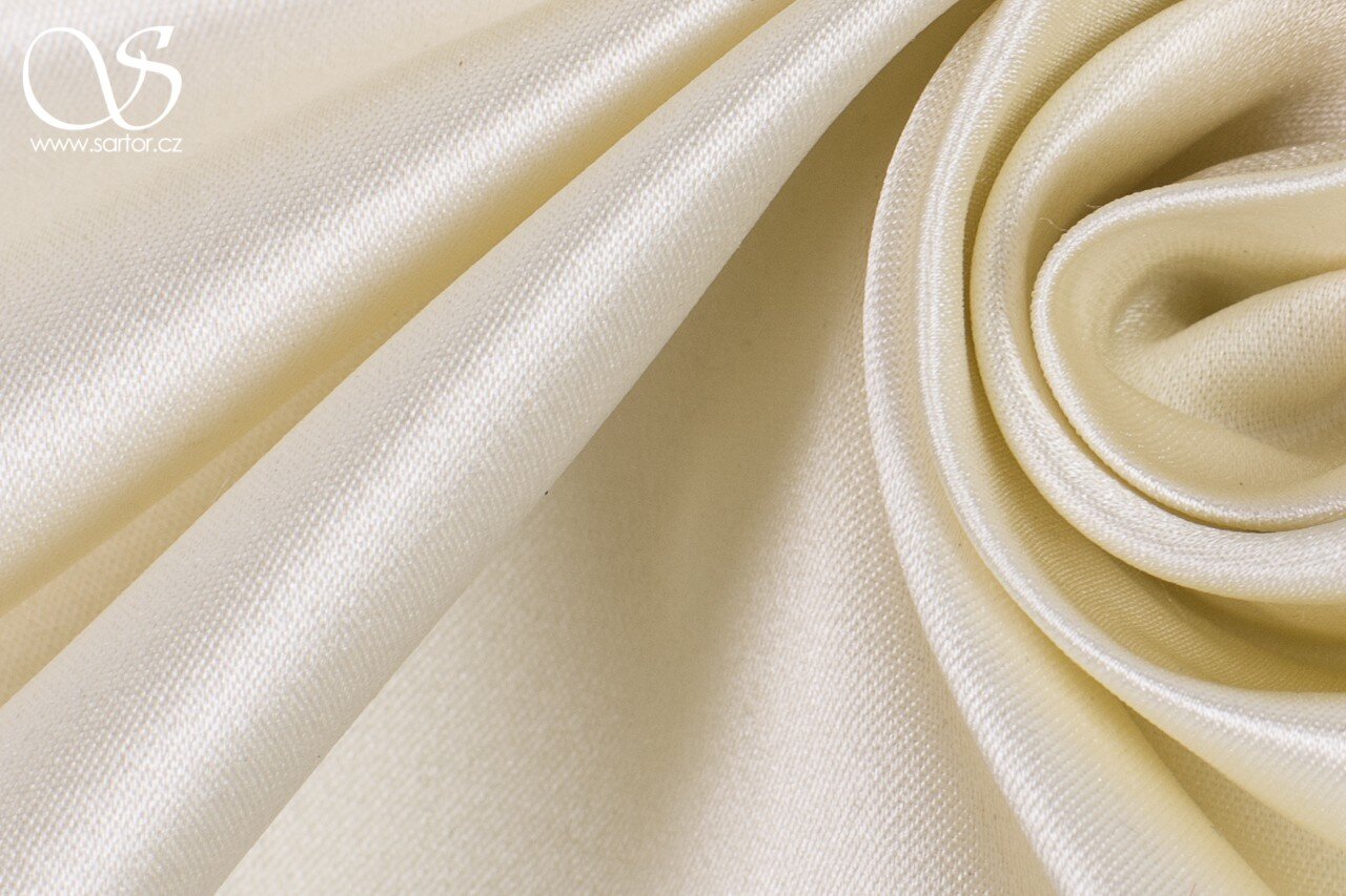 Těžká, matně lesklá látka z přírodního hedvábí skutečně luxusního vzhledu v teplém odstínu bílé. Skvělá látka na svatební a společenské šaty, popřípadě na korzety, sukně či kabátky.