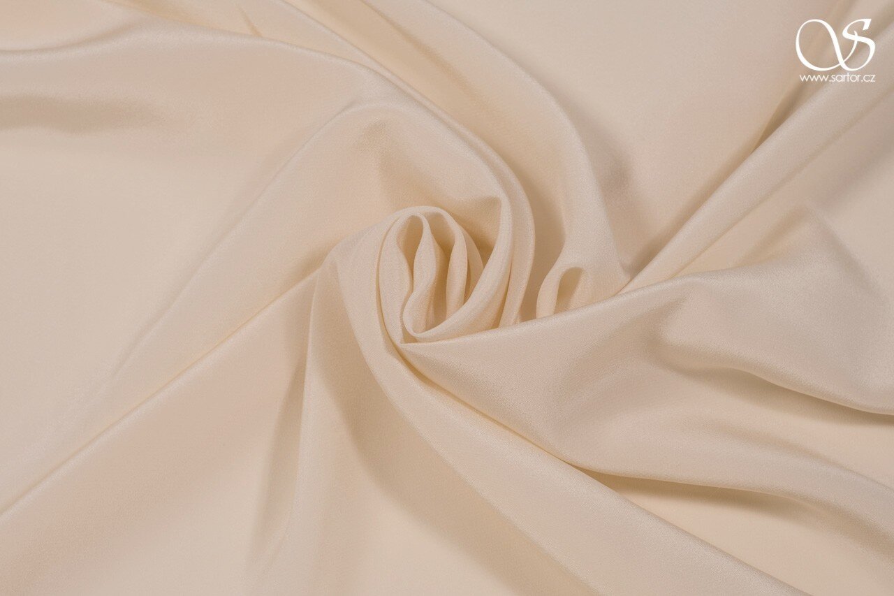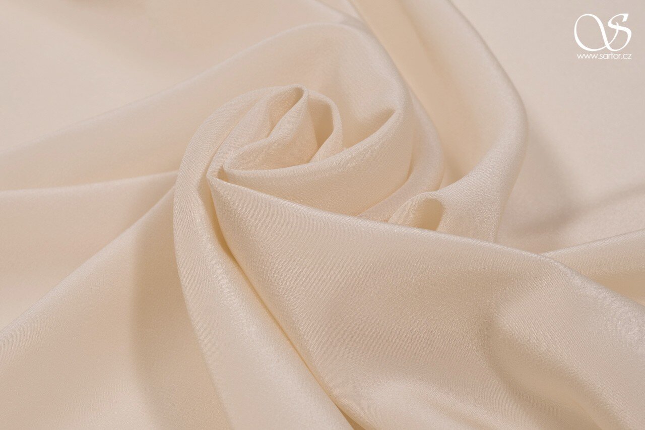 Krásně splývavá hedvábná látka s matným leskem v champagne barvě. Vynikne v šikmém střihu, na společenských i letních šatech a halenkách. Hodí se též na hedvábné šátky a luxusní noční prádlo.