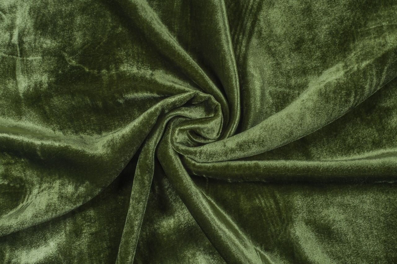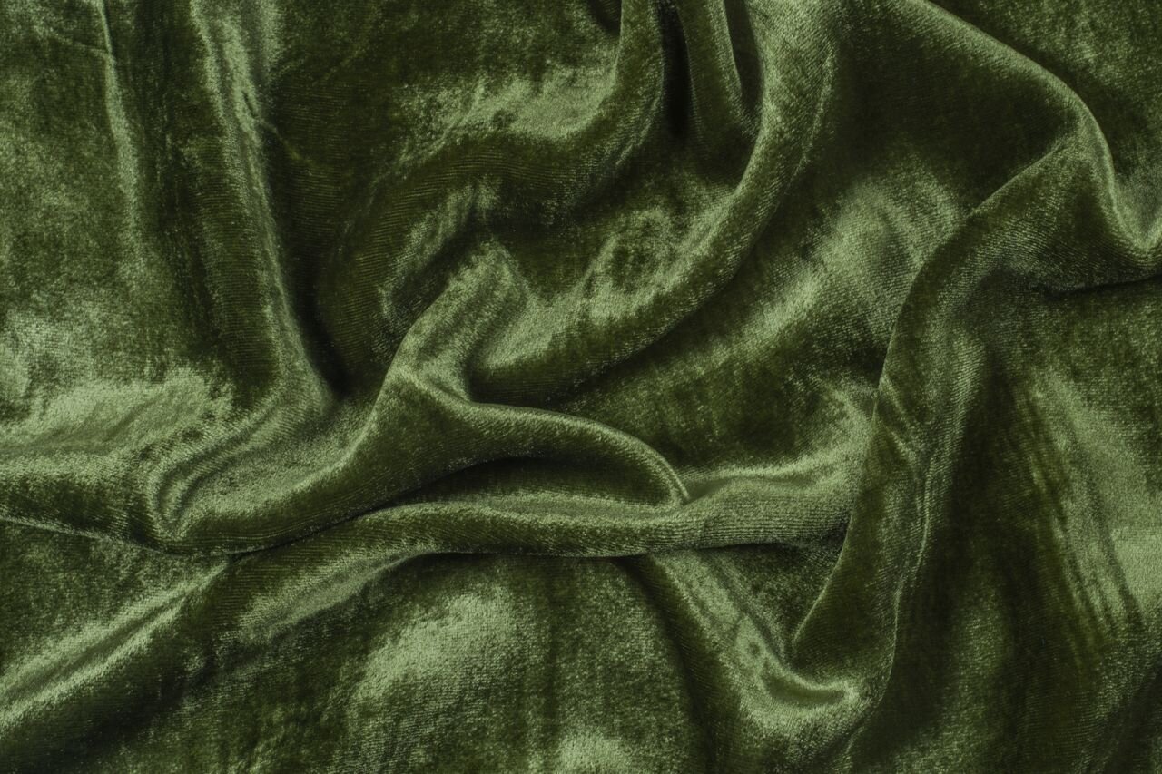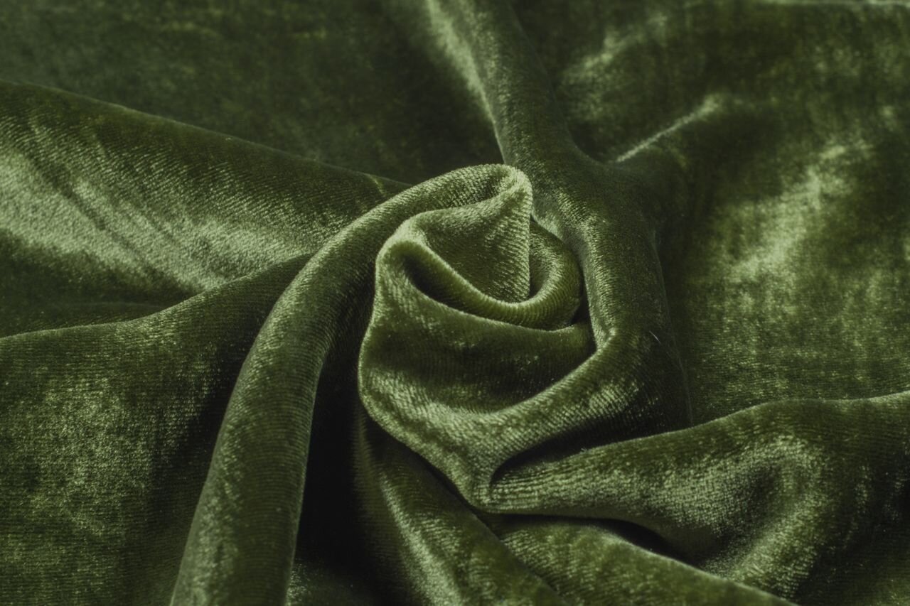 Lehký splývavý samet z přírodního hedvábí a viskózy v olivově zelené barvě. Hodí se na topy, šaty, sukně i na kabátky a plédy. Protože je na rozdíl od běžných sametů splývavý, sluší mu výstřih typu voda i řasení.