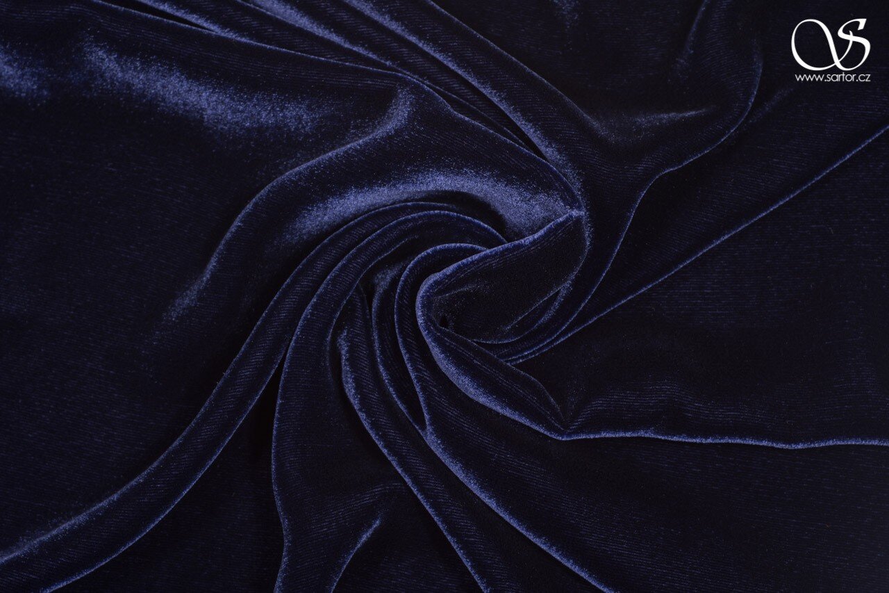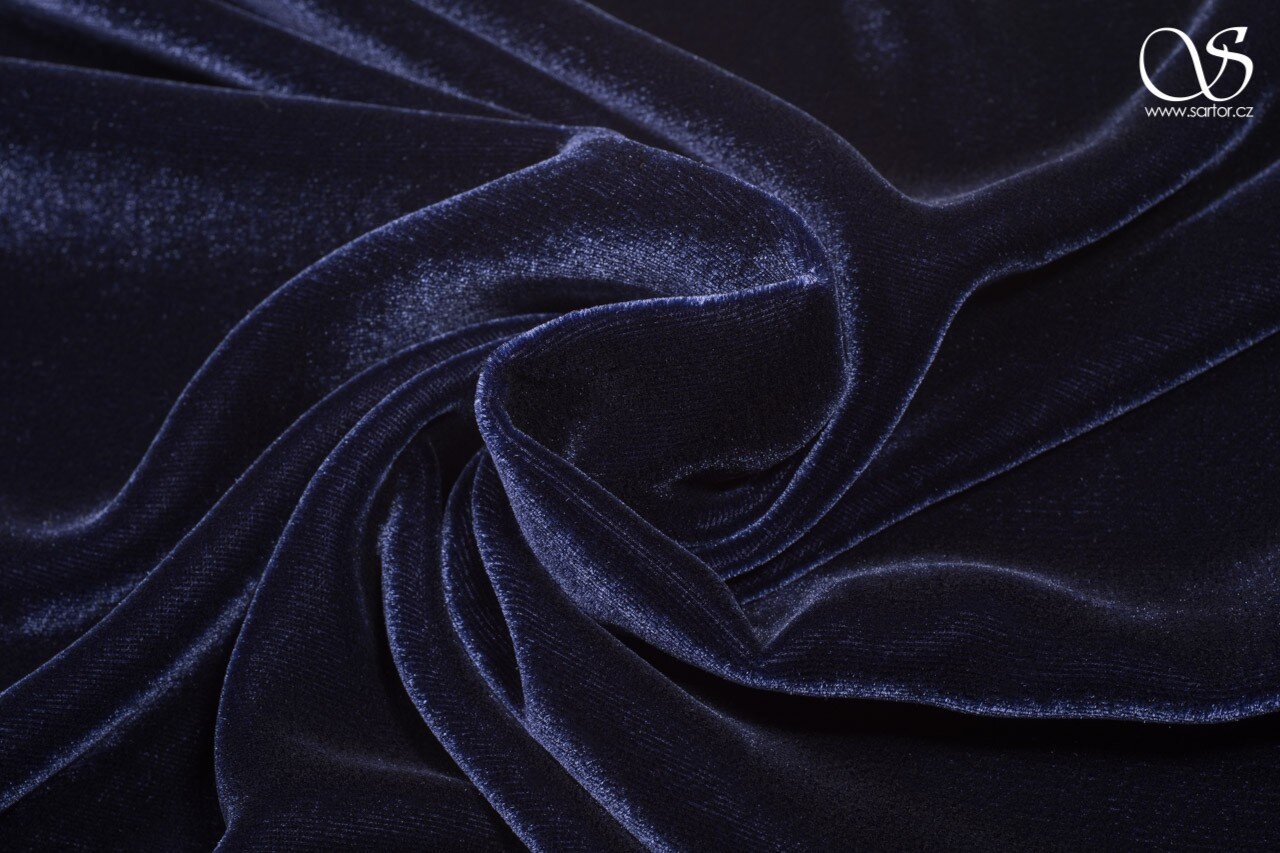 Lehký splývavý samet z přírodního hedvábí a viskózy v modré barvě s odlesky do fialova. Hodí se na topy, šaty, sukně i na kabátky a plédy. Protože je na rozdíl od běžných sametů splývavý, sluší mu výstřih typu voda i řasení.