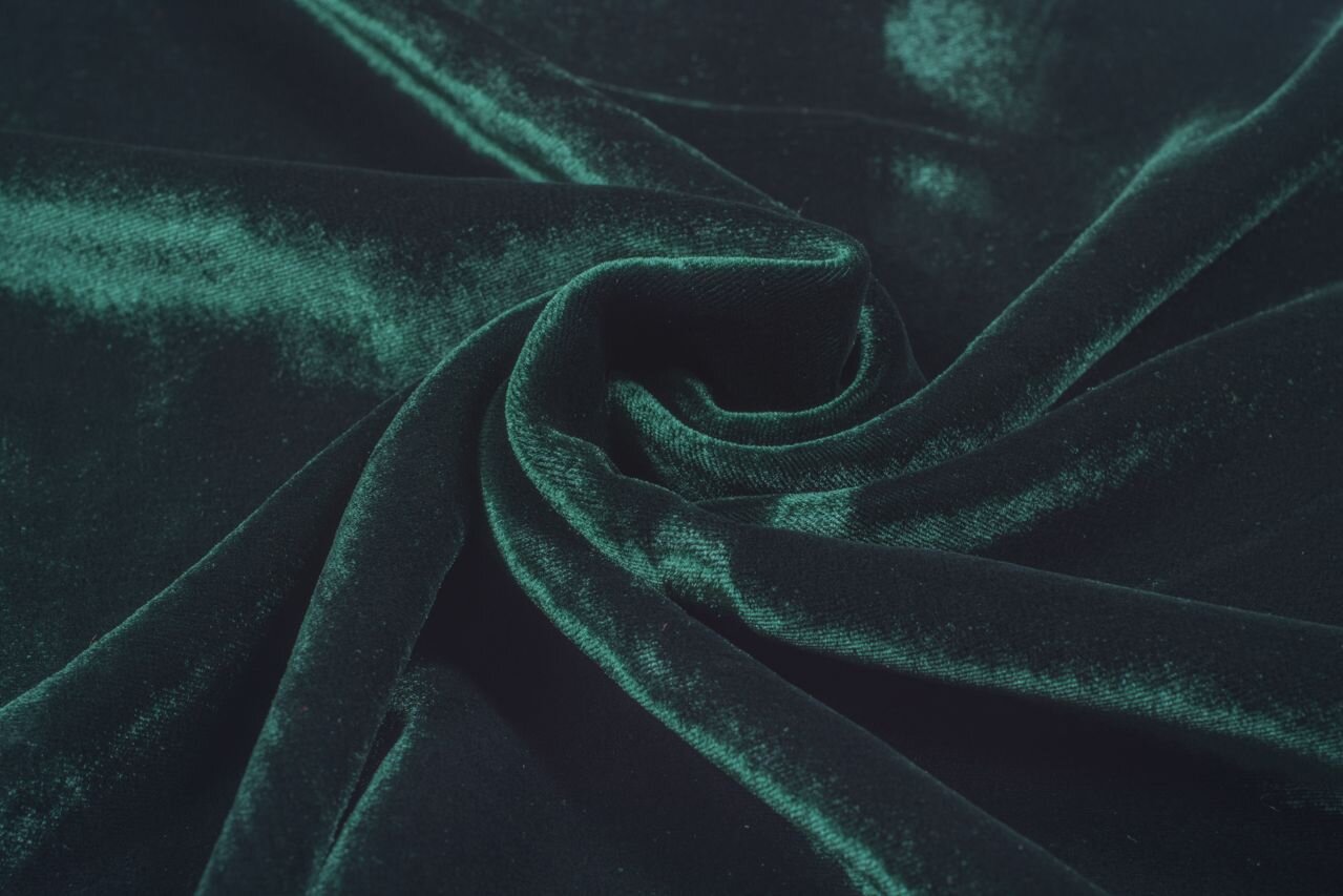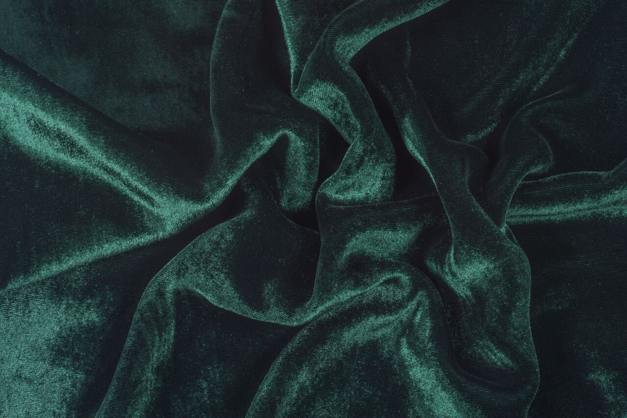 Tento samet v tmavě zelené barvě je utkán ze dvou jemných, hebkých materiálů: podklad je hedvábný, vlas viskózový. Díky tomu je prodyšný a příjemný na nošení, a také vyniká svou „tekutou“ splývavostí (na rozdíl od běžného bavlněného sametu, který je tuhý) a způsobem, jakým odráží světlo: matný povrch vrhá na světle zářivé odlesky, které krásně vyniknou na mírně řasených střizích.