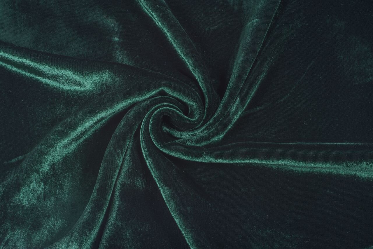 Lehký splývavý samet z přírodního hedvábí a viskózy v tmavě zelené barvě. Hodí se na topy, šaty, sukně i na kabátky a plédy. Protože je na rozdíl od běžných sametů splývavý, sluší mu výstřih typu voda i řasení.