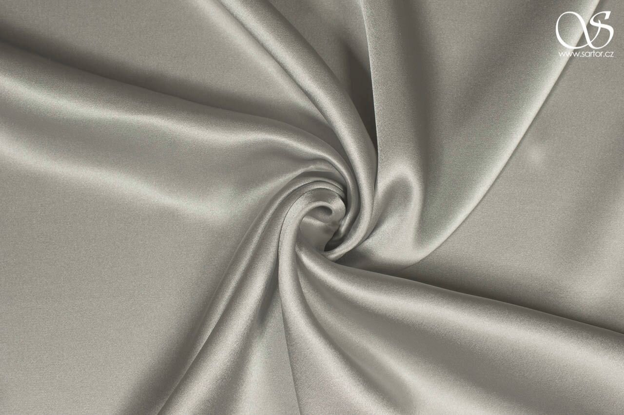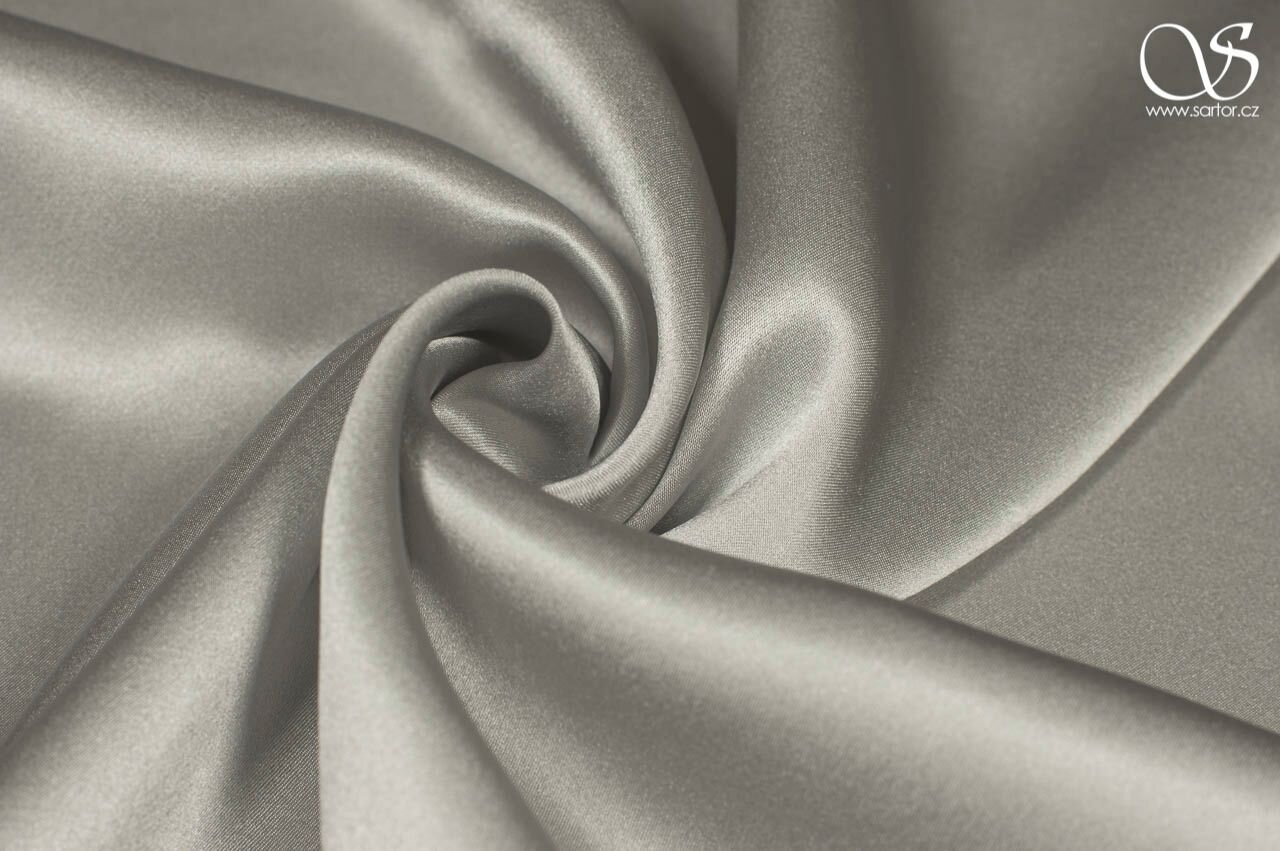 Splývavá hedvábná látka s hladkým lesklým povrchem ve světle šedé barvě. Hodí se na halenky, slavnostní šaty i na luxusní noční a spodní prádlo. Výborně si rozumí s šikmým střihem.