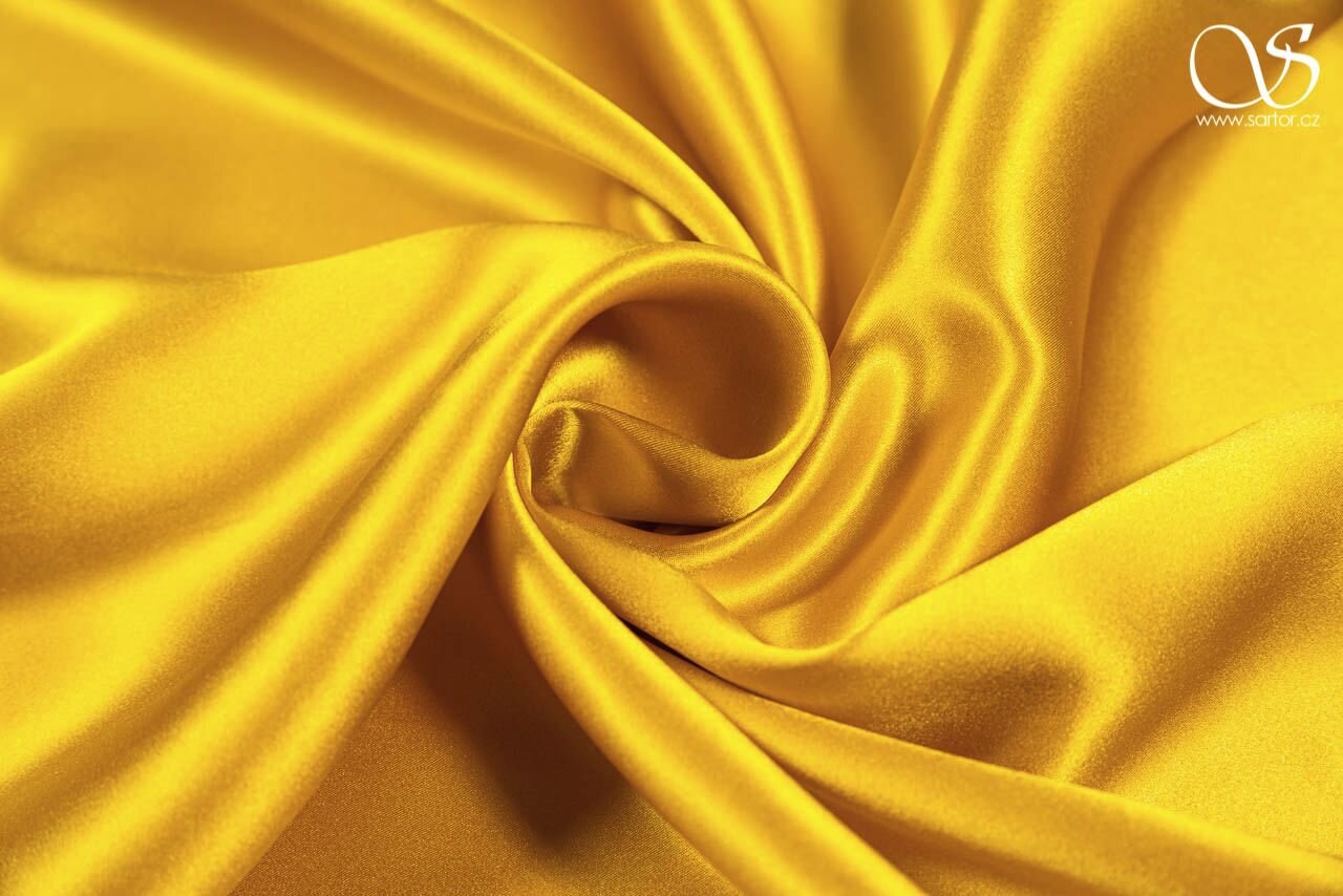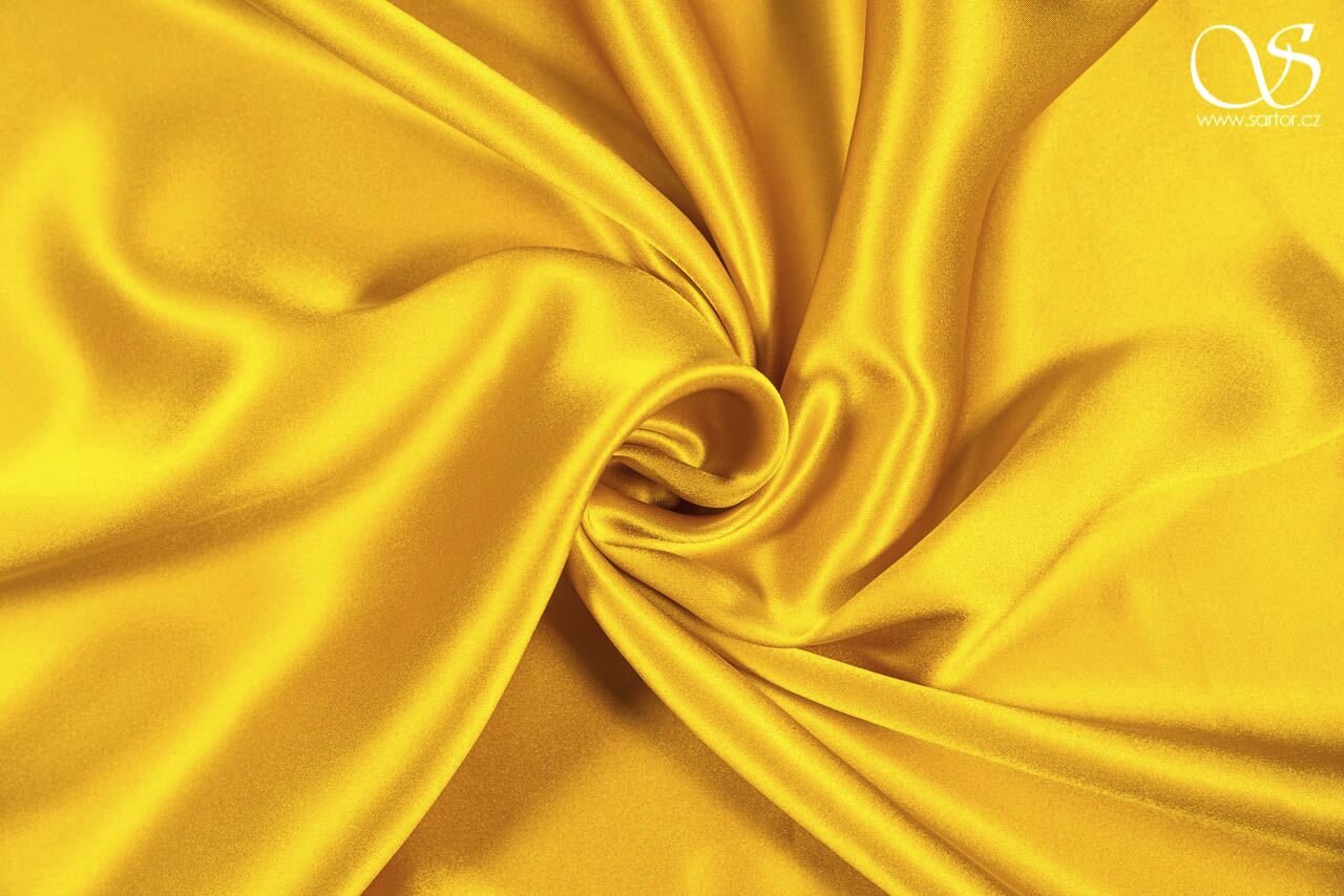 Splývavá hedvábná látka s hladkým lesklým povrchem ve žluté barvě. Hodí se na halenky, slavnostní šaty i na luxusní noční a spodní prádlo. Výborně si rozumí s šikmým střihem.