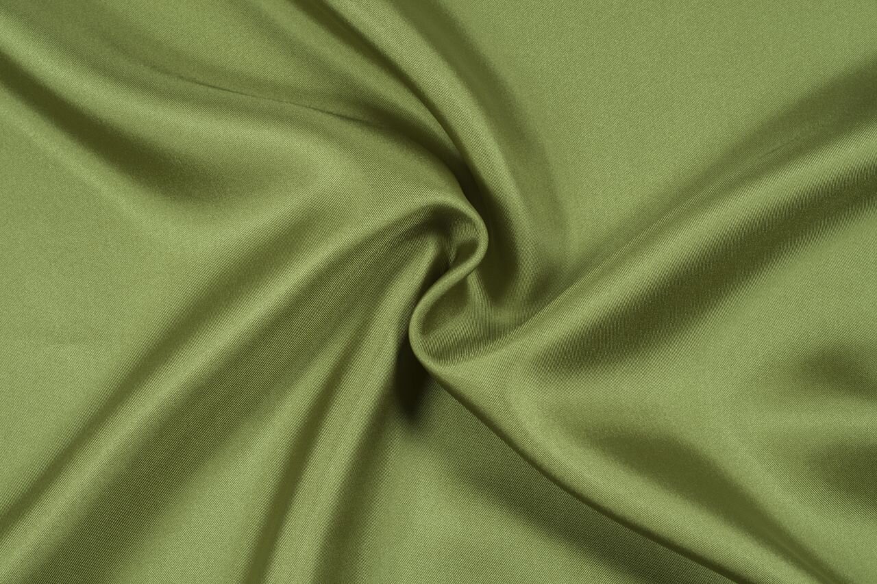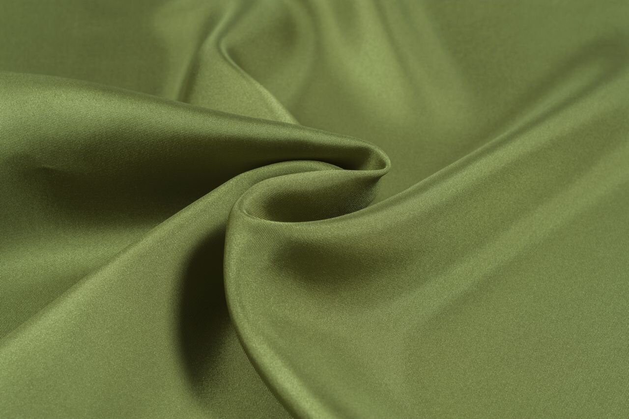 Pevná, hustě tkaná, ale lehká látka z přírodního hedvábí s jemným šikmým proužkováním v olivově zelené barvě vhodná jako luxusní podšívka, na hedvábné šátky, halenky i šaty.