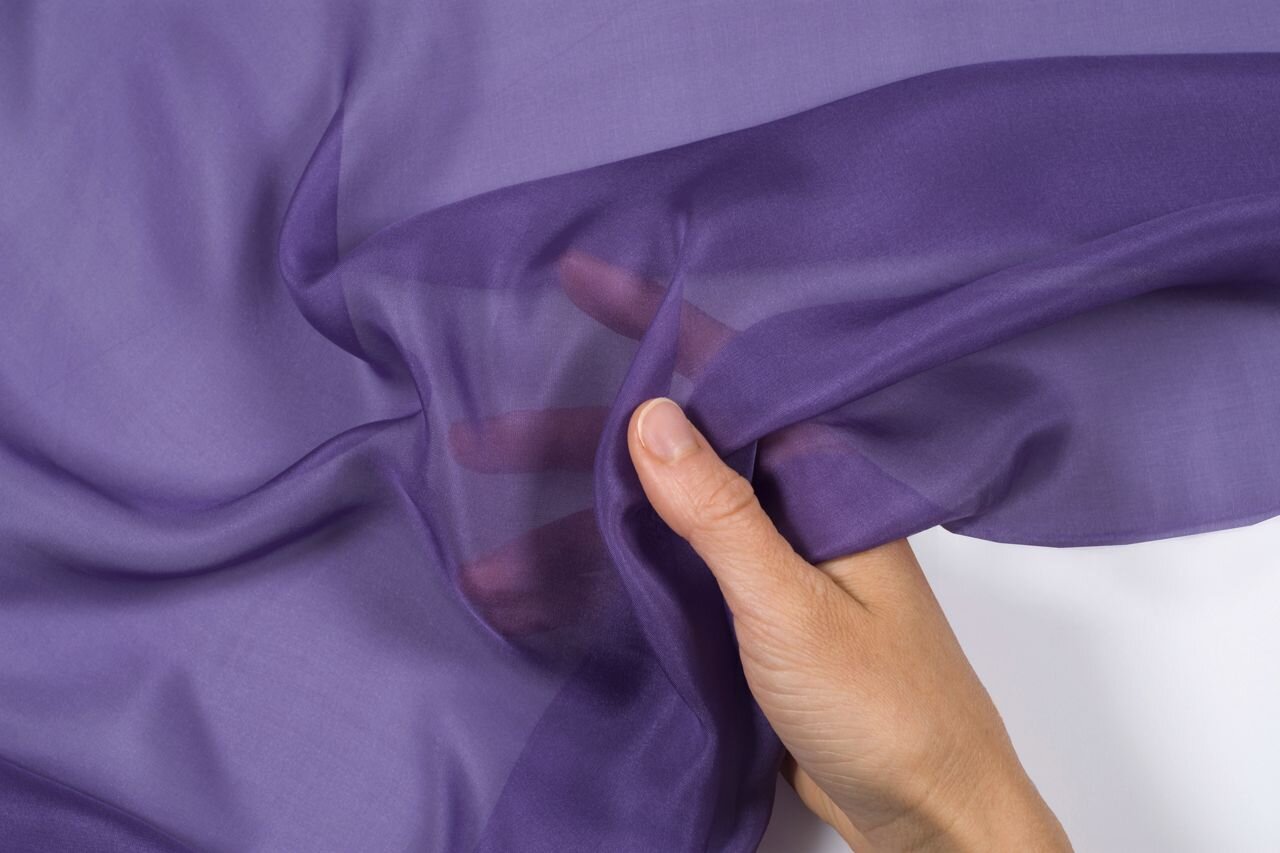 Šifon je jedna z nejlehčích hedvábných látek; jemná, vzdušná a splývavá. Průhledná látka z morušového hedvábí ve fialové barvě vhodná na vlající vrstvené šaty, vlečky, svůdné rukávy a vzdušné šály.