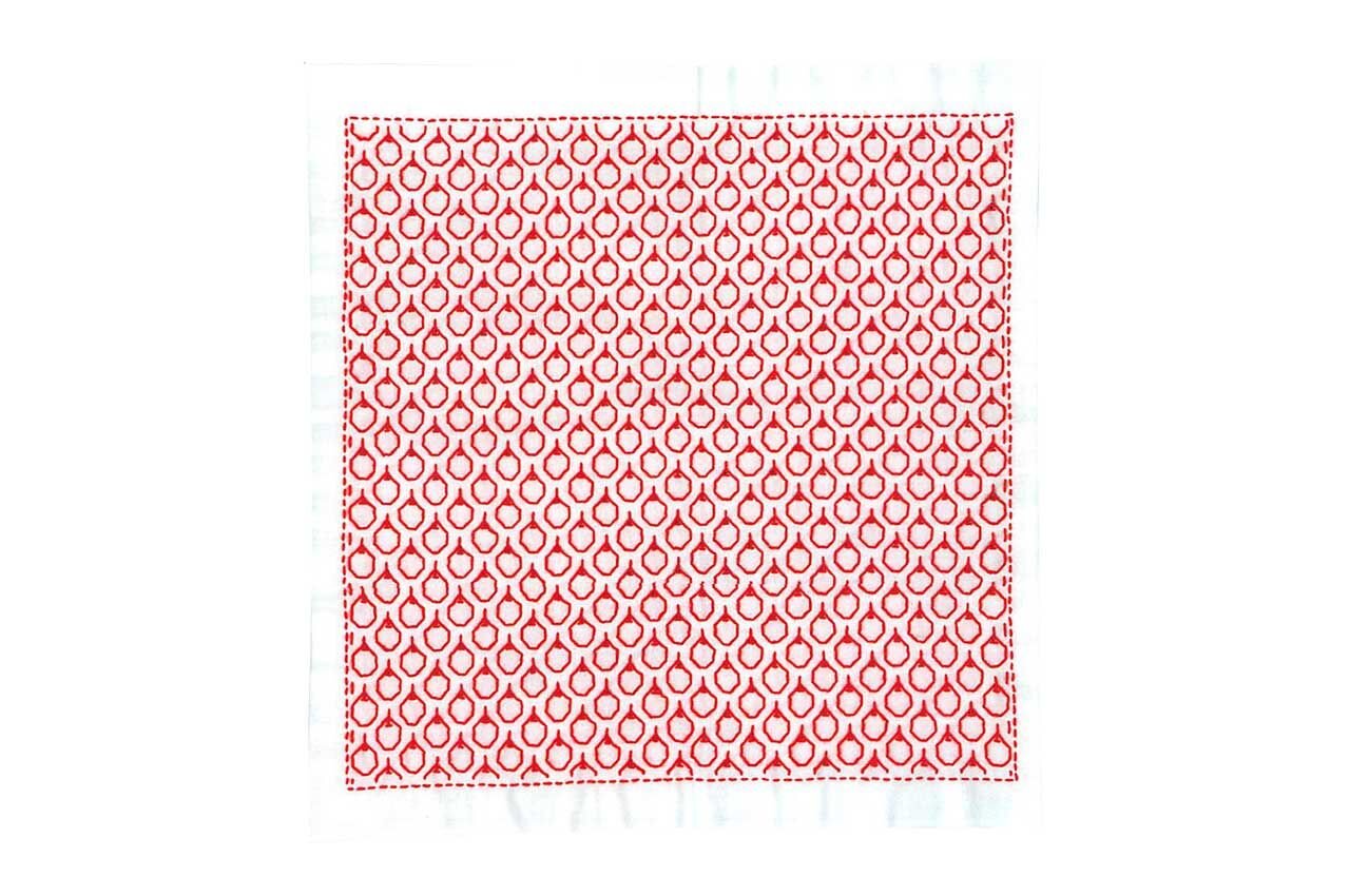 Velká sada na sashiko jednoho stehu je jednoduchý způsob, jak si osvojit nebo prohloubit tuto techniku. Obsahuje bílé plátno s předtištěným vzorem, nit v červené barvě a jehlu. Vyzkoušejte si japonskou techniku prošívání a vyrobte si dekoraci pro váš domov.