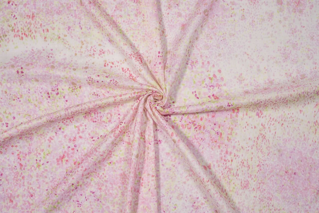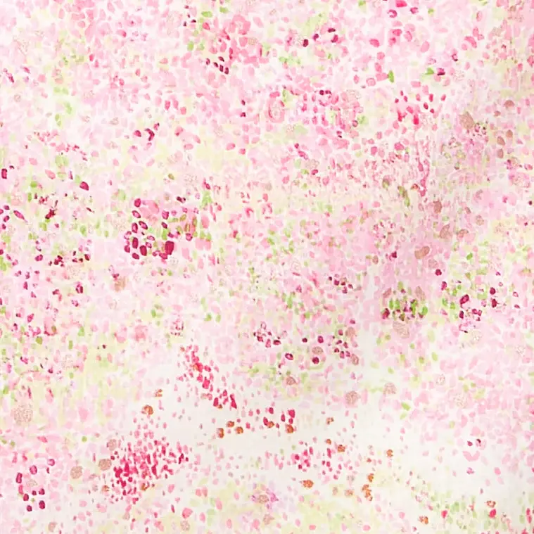 Vzor Bird’s Eye ukazuje pohled na přírodu z ptačí perspektivy. Co asi vidí ptáci, když přelétají nad ovocnými sady a loukami plnými květin? Malířka si představila krajinu plnou květů a zeleně a zachytila ji drobnými, impresionistickými tahy štětce. V této barevné variantě převládají růžové odstíny, jako byste letěli nad rozkvetlými jabloněmi nebo nekonečným záhonem růží.