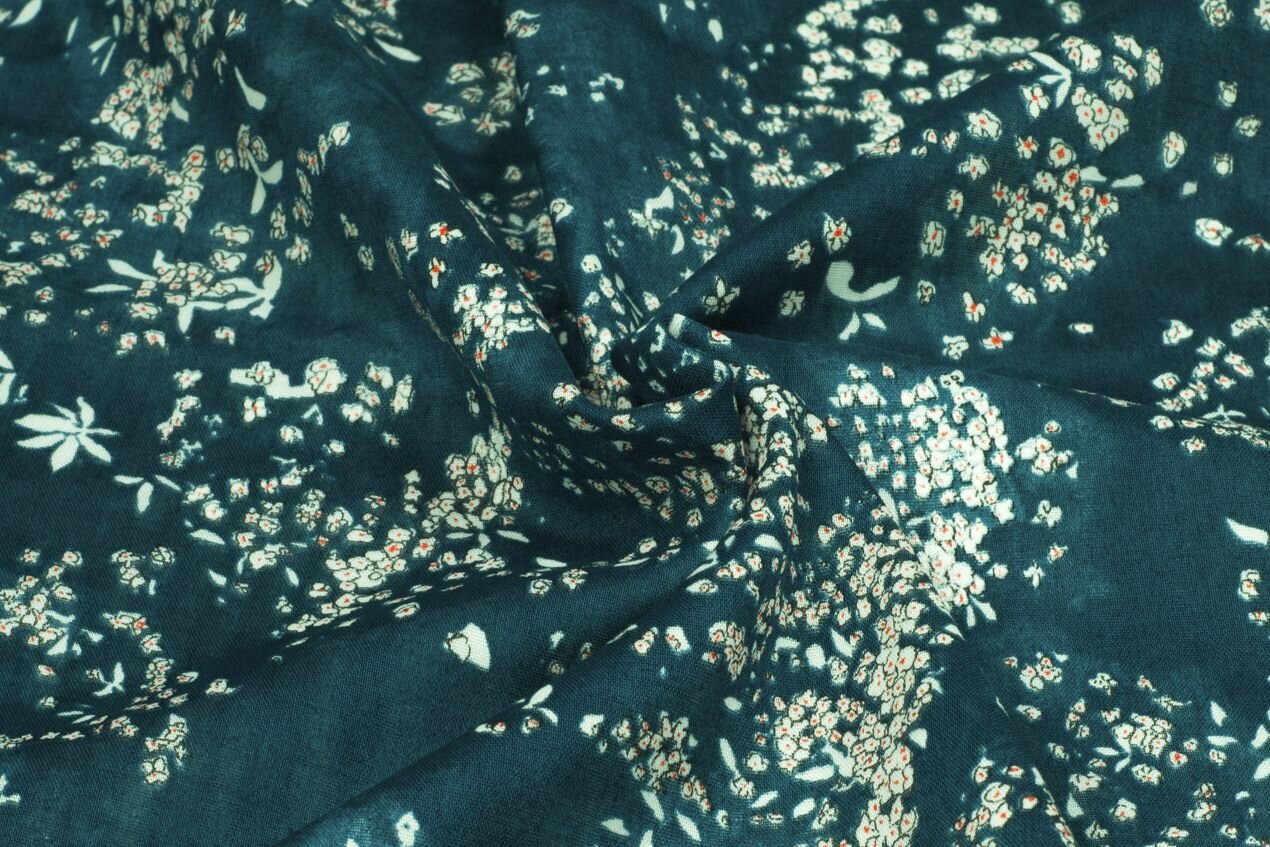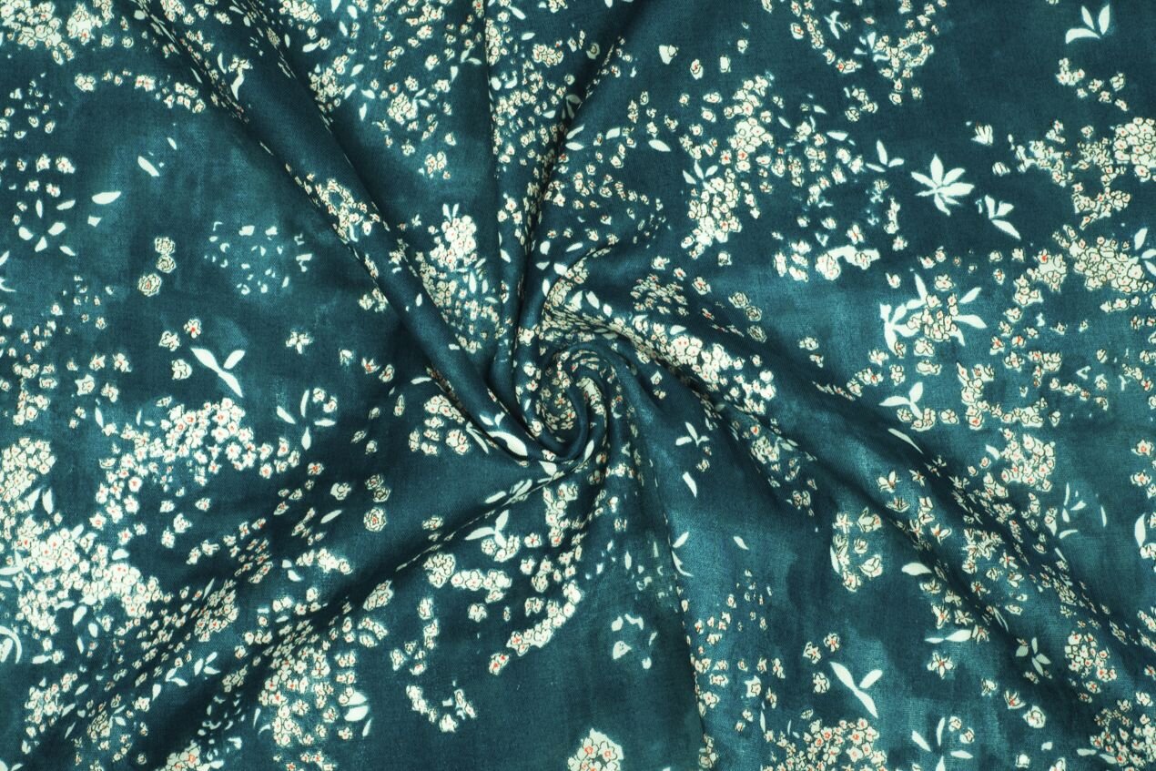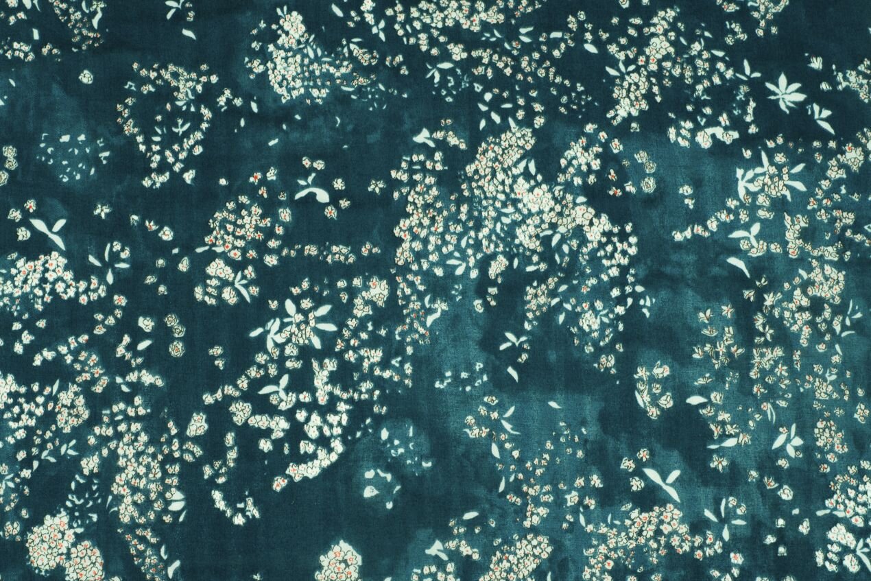Designová látka od japonské návrhářky Naomi Ito. Jemné bílé kvítky a lístečky jsou natištěné na kvalitní dvojité gázovině ze 100% bio bavlny. Látka je lehoučká a prodyšná, přitom ale poměrně pevná. Je skvělá na stylové oblečení i do interiéru.