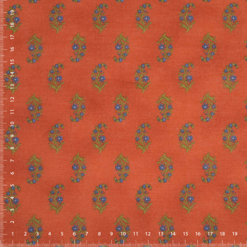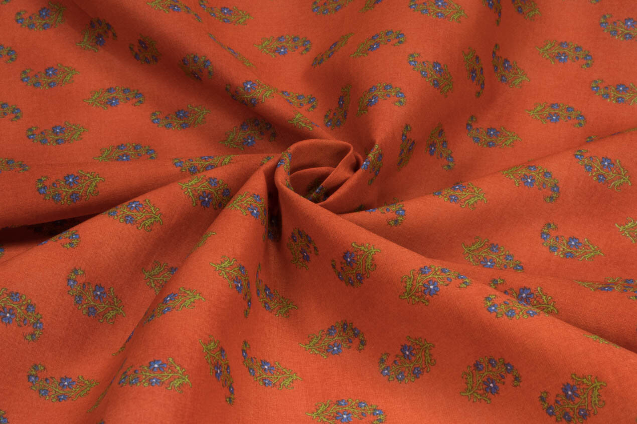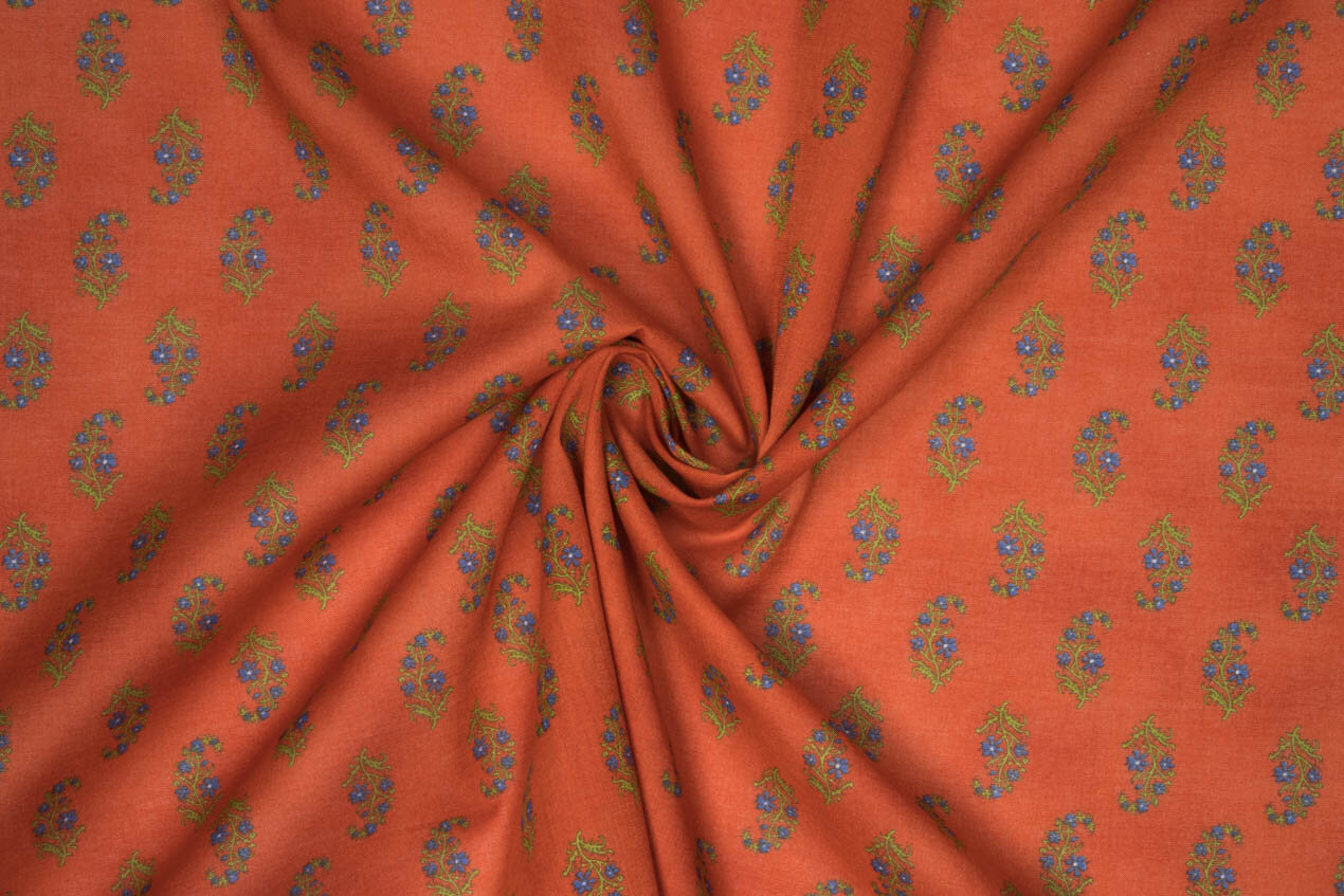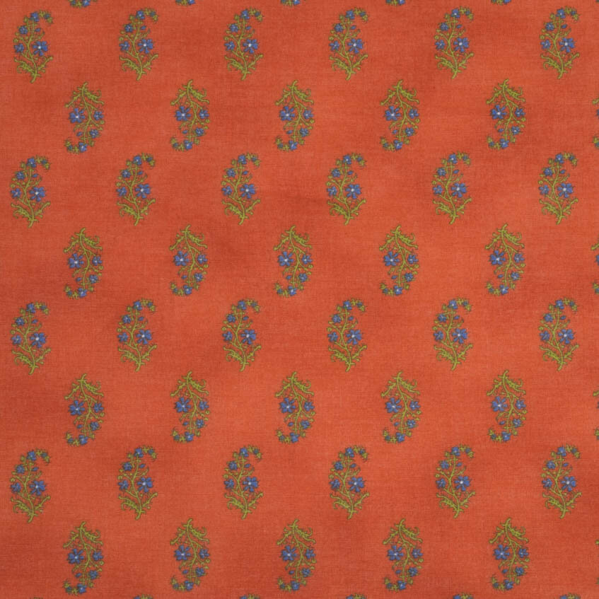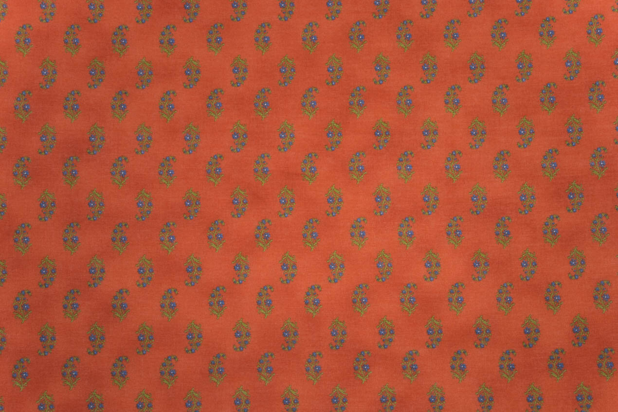 Oryginalny nadruk Kokka o nazwie Buti opiera się na tradycyjnym indyjskim wzorze składającym się z regularnie powtarzających się małych motywów. W tej koncepcji jest to jednak japoński wzór, który jest luźno inspirowany indyjskimi nadrukami tekstylnymi i ich rytmem. Delikatne gałązki niebieskich kwiatów są regularnie rozmieszczone na głębokim pomarańczowym podłożu, tworząc żywą, ale wyrafinowaną całość.