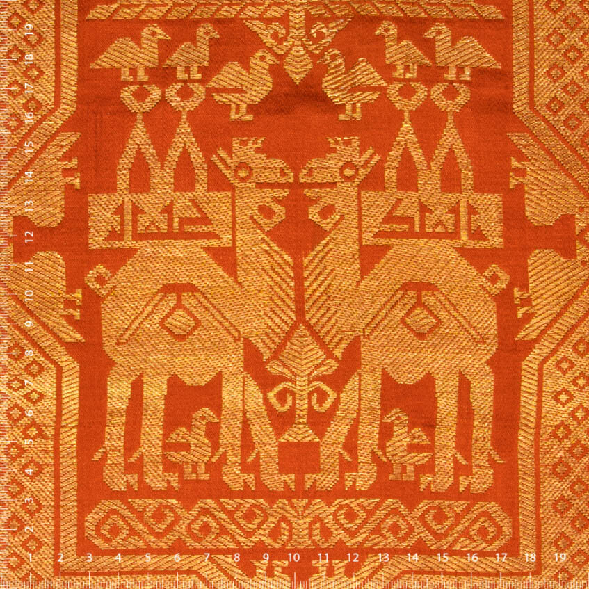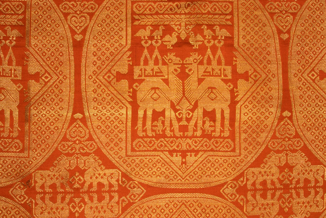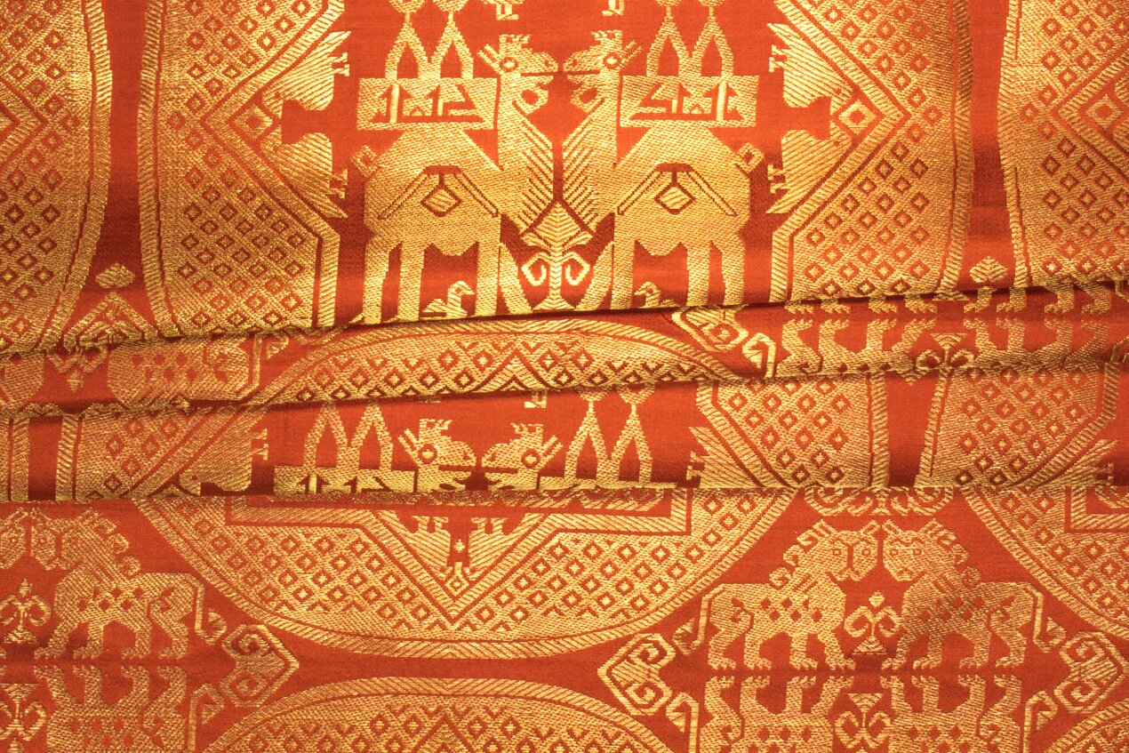 Ręcznie tkany brokat z naturalnego jedwabiu jest oparty na zachowanym średniowiecznym jedwabiu z X wieku. Charakterystyczny wzór złotego medalionu na ceglastoczerwonym tle ma świąteczny charakter i niesie ze sobą dziedzictwo dworskiej reprezentacji wczesnego świata islamu. Oryginalna tkanina nie tylko do szycia autentycznych historycznych kostiumów i dekoracji, ale także dla twórców poszukujących naprawdę wyjątkowego materiału do współczesnych projektów.