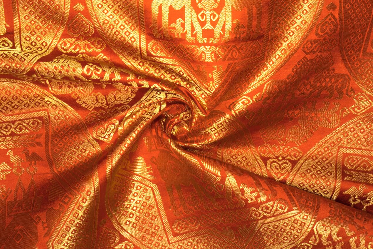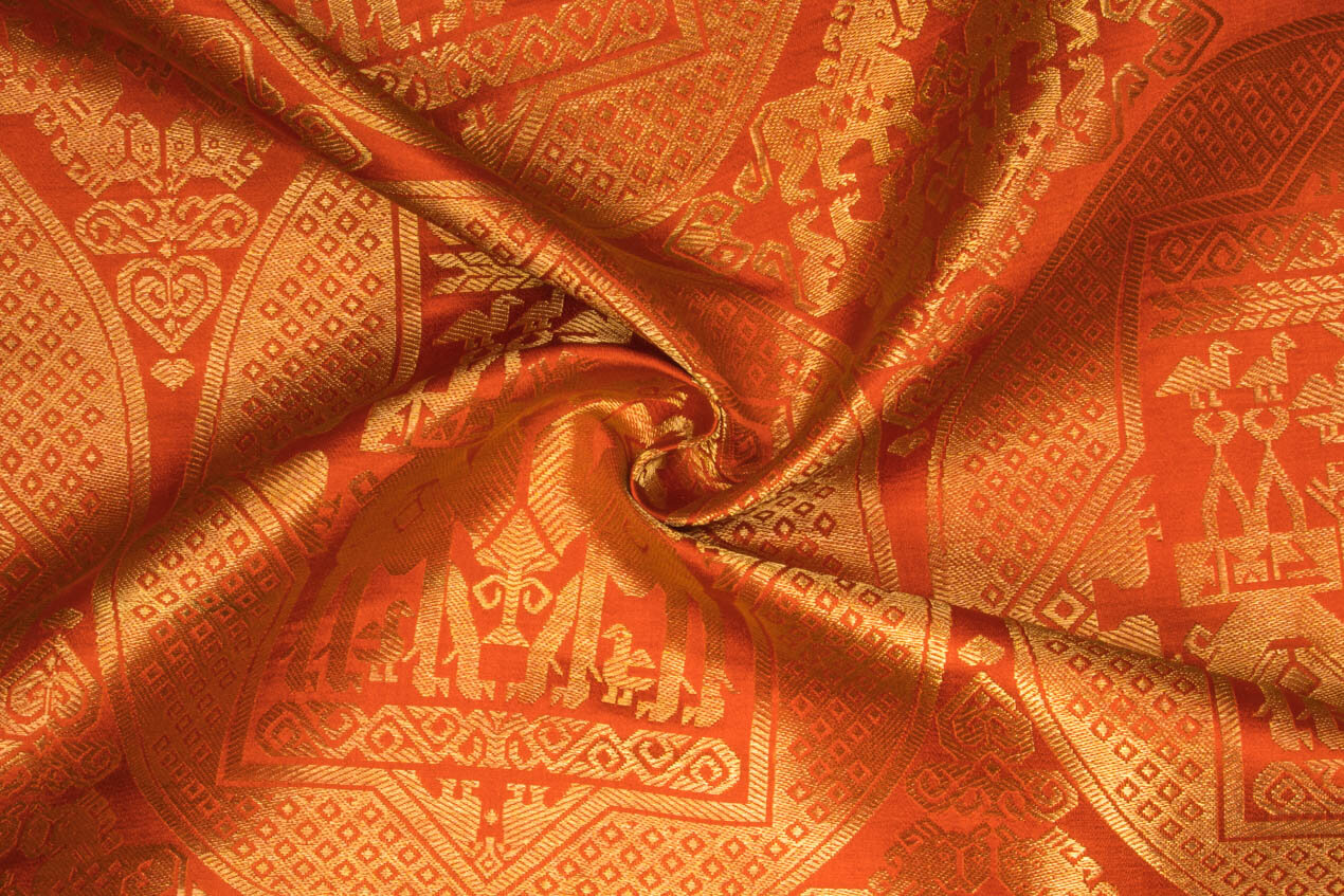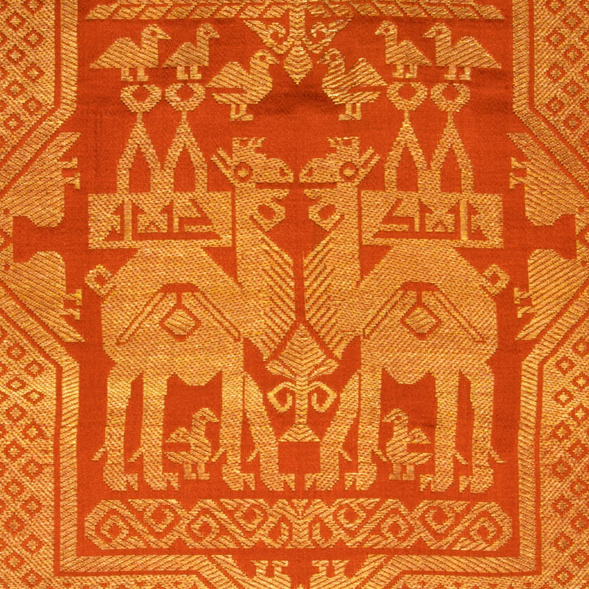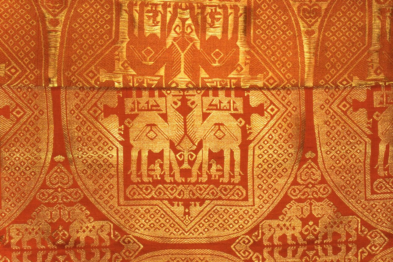 Ręcznie tkany brokat z naturalnego jedwabiu jest oparty na zachowanym średniowiecznym jedwabiu z X wieku. Charakterystyczny wzór złotego medalionu na ceglastoczerwonym tle ma świąteczny charakter i niesie ze sobą dziedzictwo dworskiej reprezentacji wczesnego świata islamu. Oryginalna tkanina nie tylko do szycia autentycznych historycznych kostiumów i dekoracji, ale także dla twórców poszukujących naprawdę wyjątkowego materiału do współczesnych projektów.