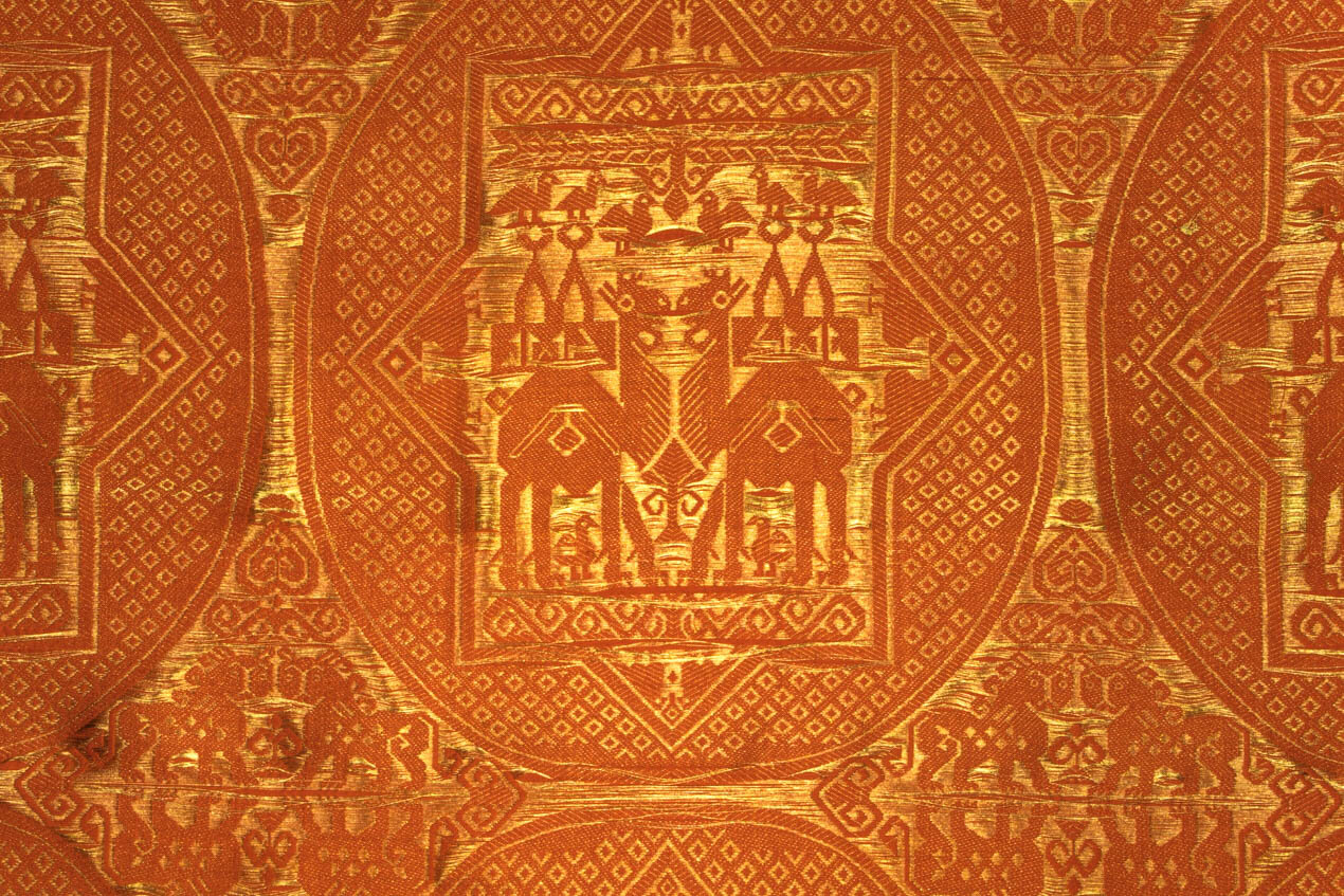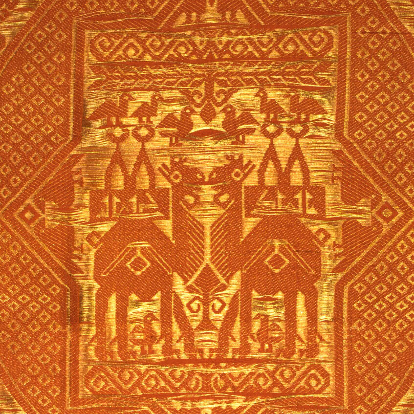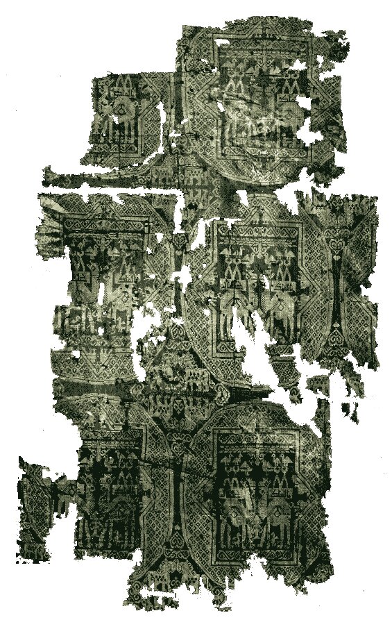 Wzór jest fragmentem jedwabiu pochodzącym z X wieku, znanym jako Roundels with camels bearing howdahs, obecnie w Cleveland Museum of Art (USA). Tkanina jest tkana w splocie płóciennym z uzupełniającym wątkiem, techniką typową dla luksusowych jedwabi wczesnego świata islamu.