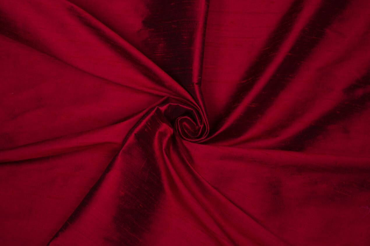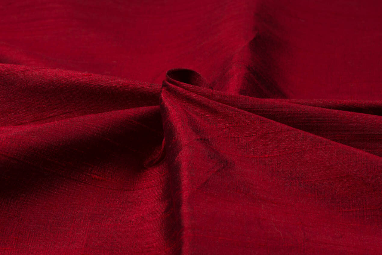 Lekko sztywna tkanina jedwabna o typowej nieregularnej strukturze w kolorze czerwonym. Jedwab dupion można wykorzystać na luksusowo wyglądającą sukienkę na bal lub wesele, ale także na ciekawe spódnice, spodnie i żakiety do codziennego noszenia lub do wnętrz na poduszki i fantazyjne zasłony. Dupion to tkanina utkana z nierównomiernie grubych nici dupionowych. Nadaje to tkaninie unikalny i często pożądany wygląd, ale jednocześnie waga tkaniny jest nieco zmienna w kierunku tkania.