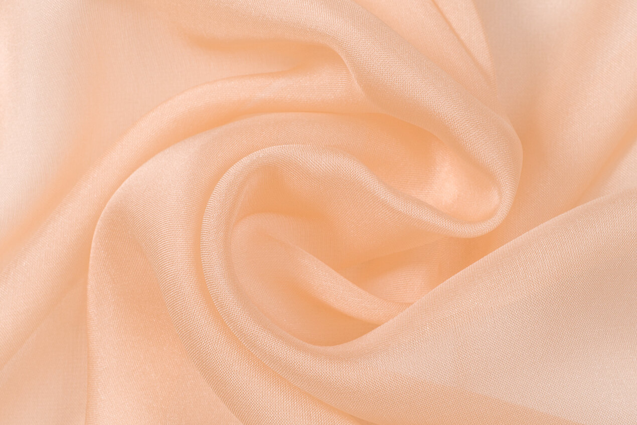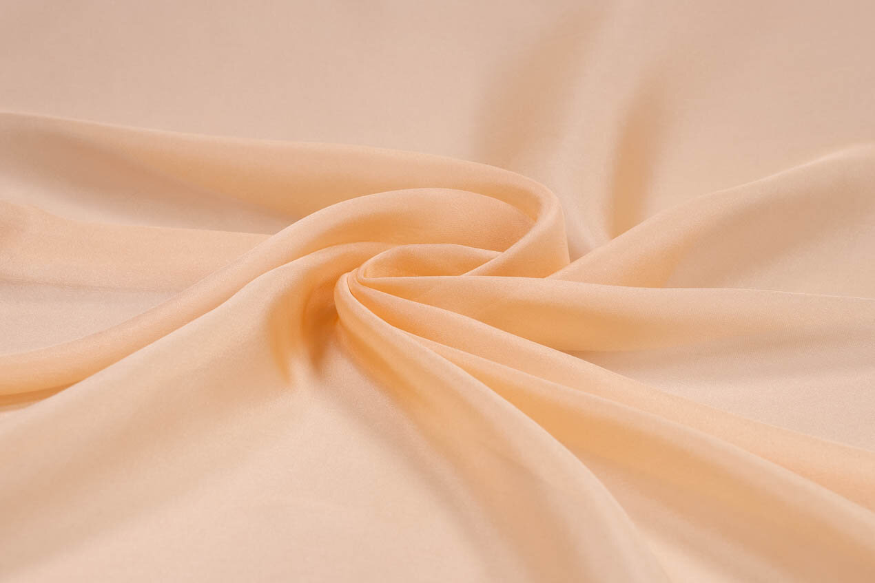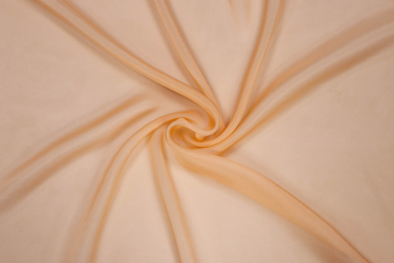 Szyfon to jedna z najlżejszych tkanin jedwabnych; miękka, przewiewna i lejąca. Przezroczysty jedwabny materiał w kolorze brzoskwiniowym nadaje się do trzepoczących warstwowych sukienek, trenów, uwodzicielskich rękawów i zwiewnych szali.