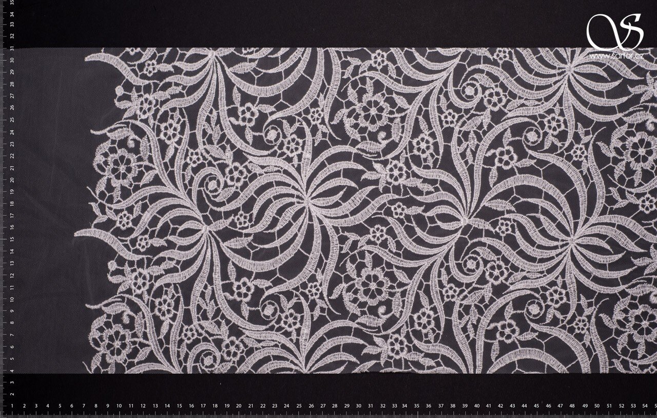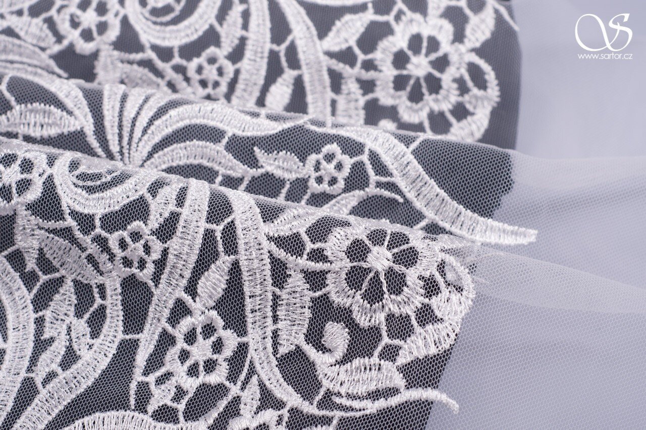 Celoplošně vyšívaná krajka na tylu ve studeném odstínu bílé vhodná na svatební a plesové šaty, na koktejlky a doplňky.