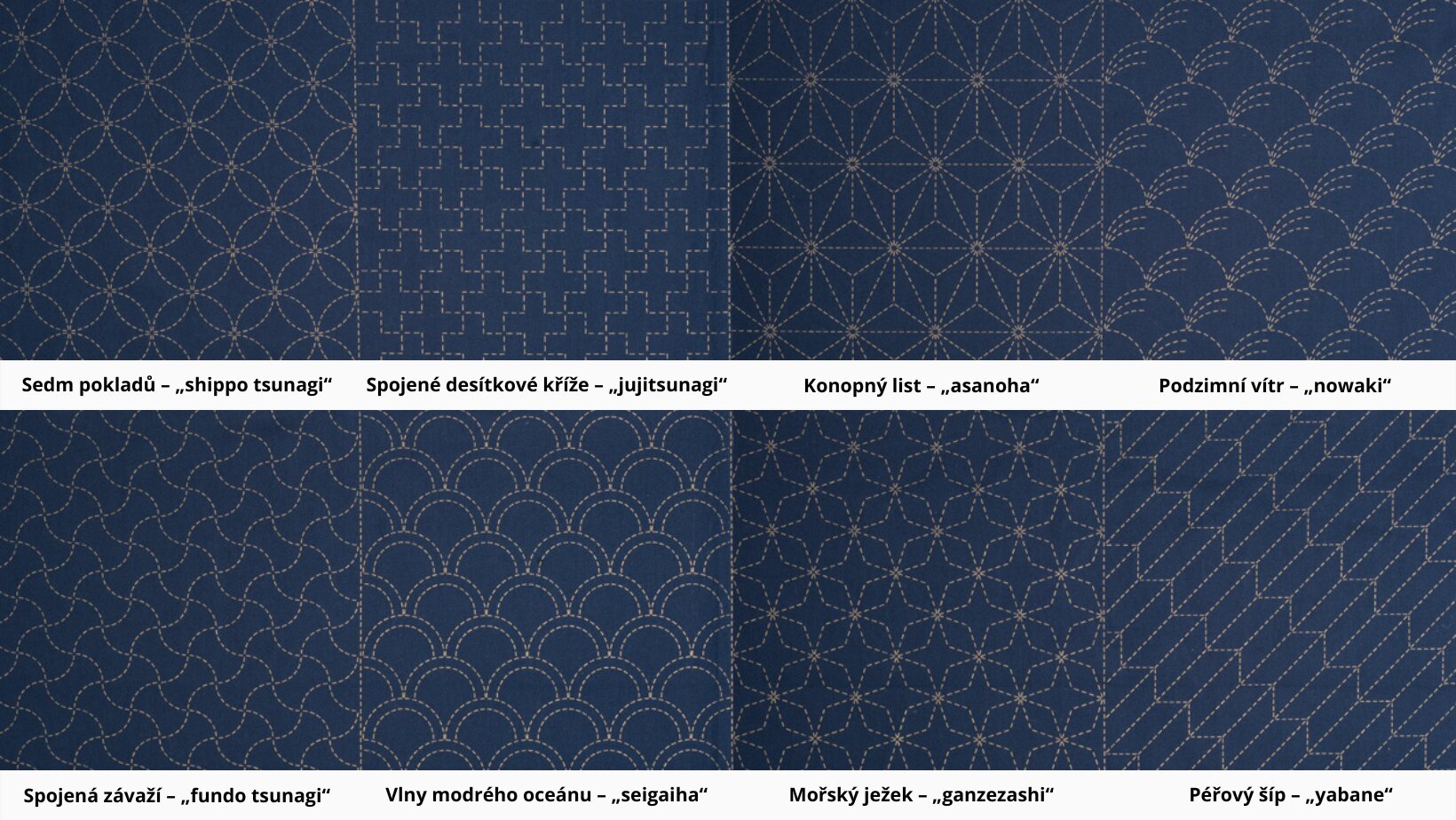 Panel látky obsahuje těchto osm oblíbených sashiko vzorů: