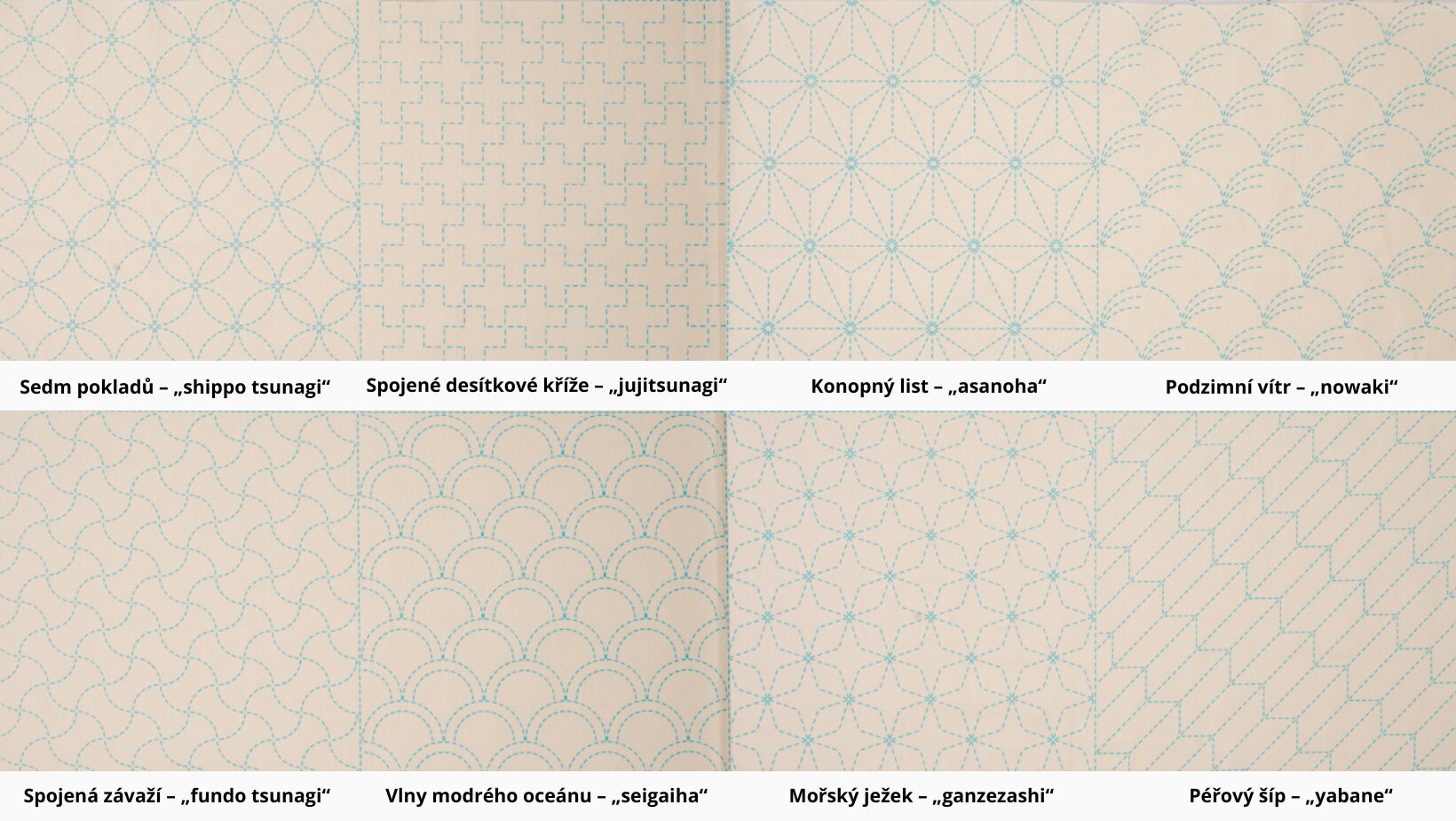 Panel látky obsahuje těchto osm oblíbených sashiko vzorů:
